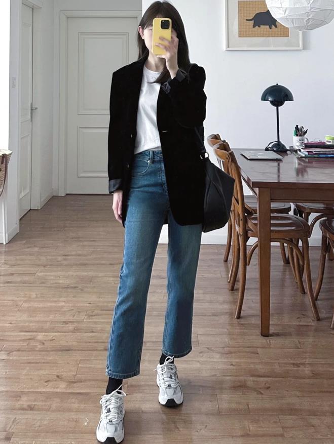 誰說穿西裝就不能配運動鞋了呢?這一套看起來很舒適又得體,經典耐看的黑西裝,好像在每年都不會過時,與九分牛仔直筒褲相配,把雙腿比例襯托得很筆直修長了,加上一雙白色運動鞋,又多了幾分舒適感。