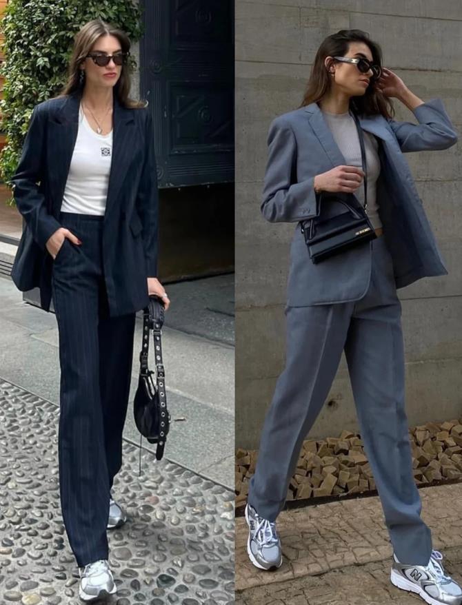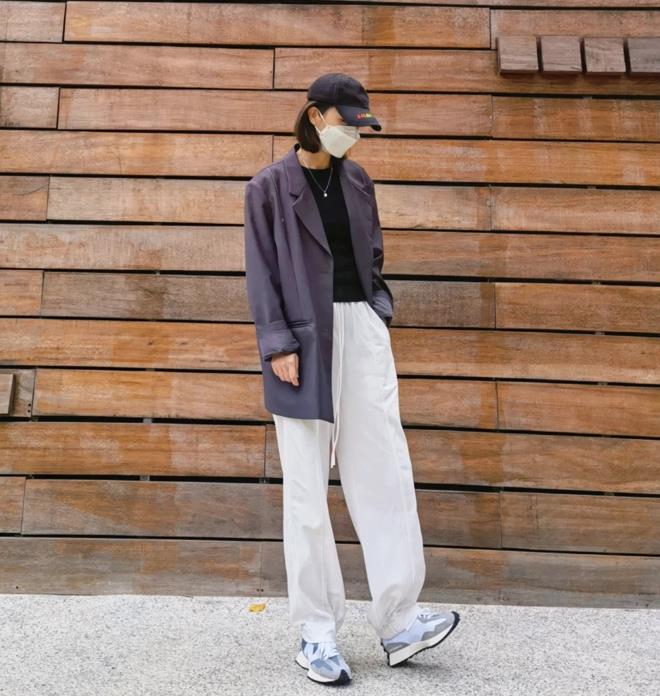 當你不知道該選擇什麼樣的配色時,黑白灰這些顏色就可以盡情利用起來,隨你怎麼搭配都不會出錯,灰色廓形休閒西裝+白色休閒褲,腳下還踩着一雙運動鞋,這樣的穿法對於梨形身材也是非常友好的,日常通勤又休閒。