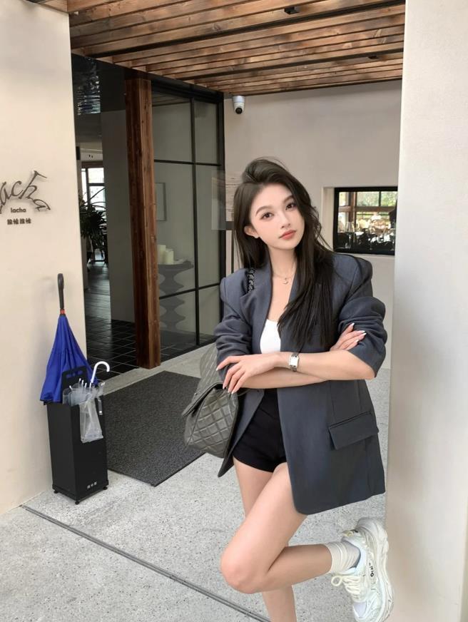 高級灰的西裝外套,和黑色一樣,都是非常經典的款式,記得在選擇西裝外套時,版型要入手寬鬆一些的,這樣才能穿得很顯瘦,也藏肉。搭配黑色牛仔短褲和白色運動鞋,一整個顯腿長,也不失休閒氣息。