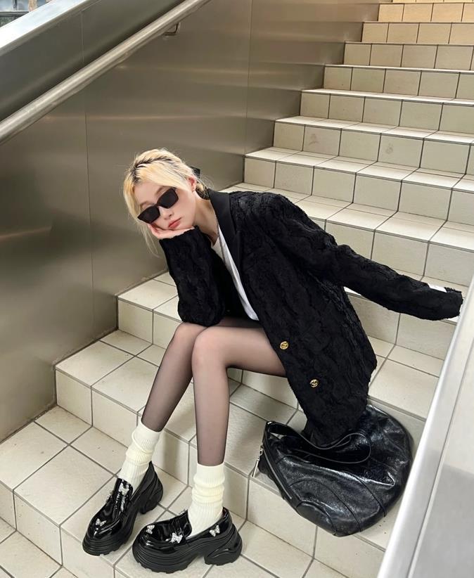 甜酷辣妹風氛圍感直接拉滿,喜歡這種風格的姐們說啥也要試試看,黑色西裝外套,細節感非常好的款式,上面有暗紋,版型是比較寬鬆的,我就覺得選西裝就得要入手這種,對身材包容性好,也藏肉顯瘦。與厚底樂福鞋相配,感覺小個子女生就比較合適這種穿搭。