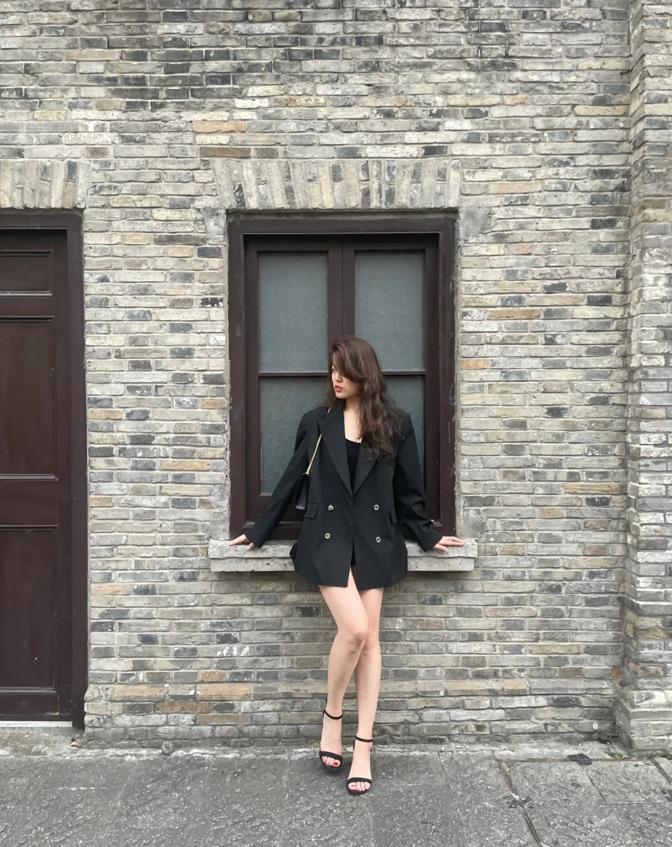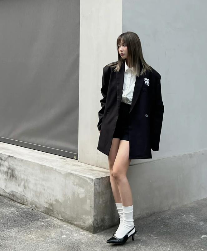 黑色西裝外套+黑色短褲,同色系的組合,就是很顯高級啊,最重要的是不容易出錯,上衣內搭了一件白色襯衫,與黑色西裝相配,一整個氣質與幹練。腳上穿着一雙白色襪子,一雙黑色高跟鞋,真的很好看。