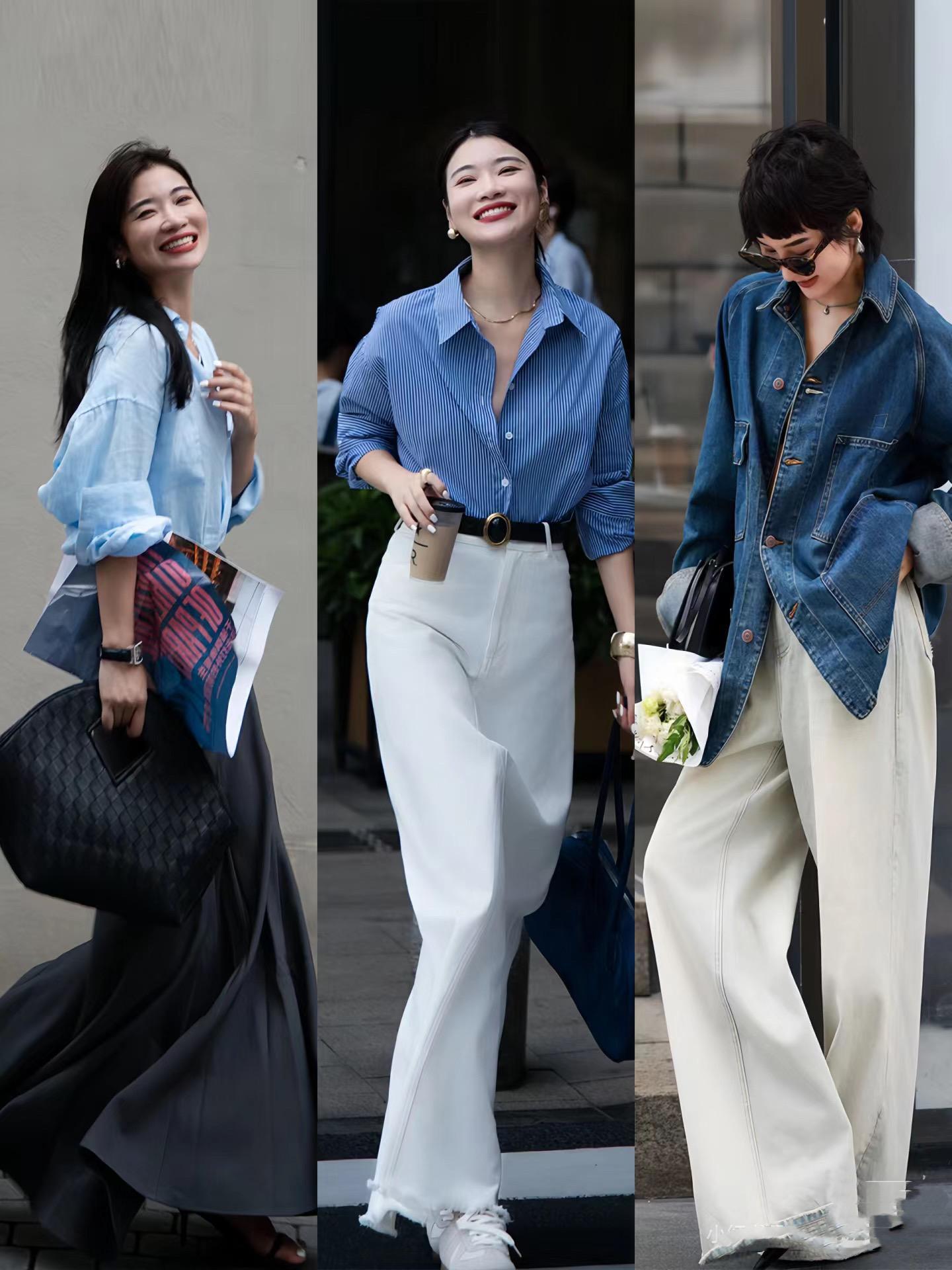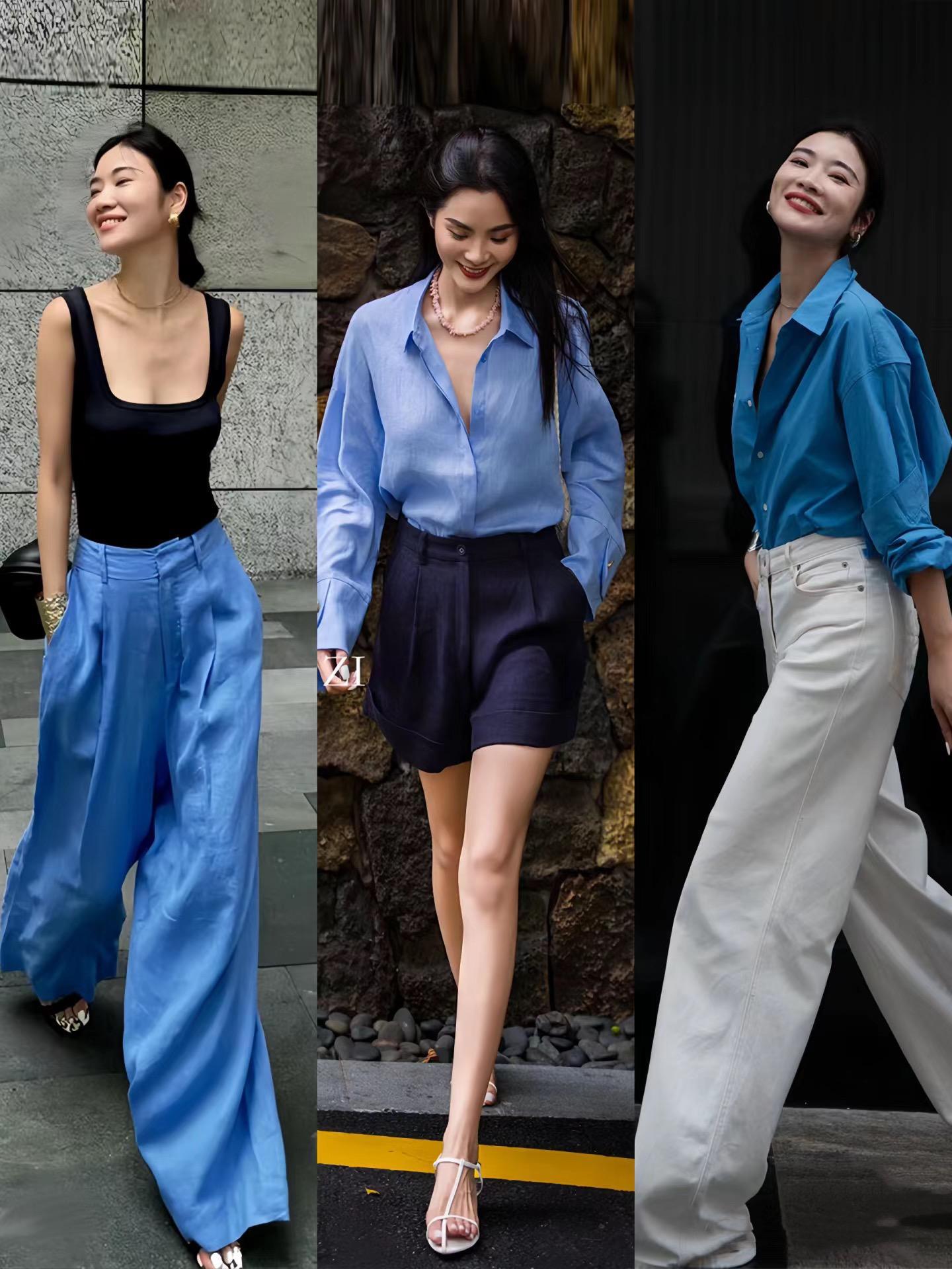 明媚清爽的配色,纔可以讓我們的穿搭更惹眼。想要洋氣減齡,還是建議大家參考藍色+白色的配色。尤其是藍色襯衫+白色闊腿褲,隨性又時髦,顯白提氣質。