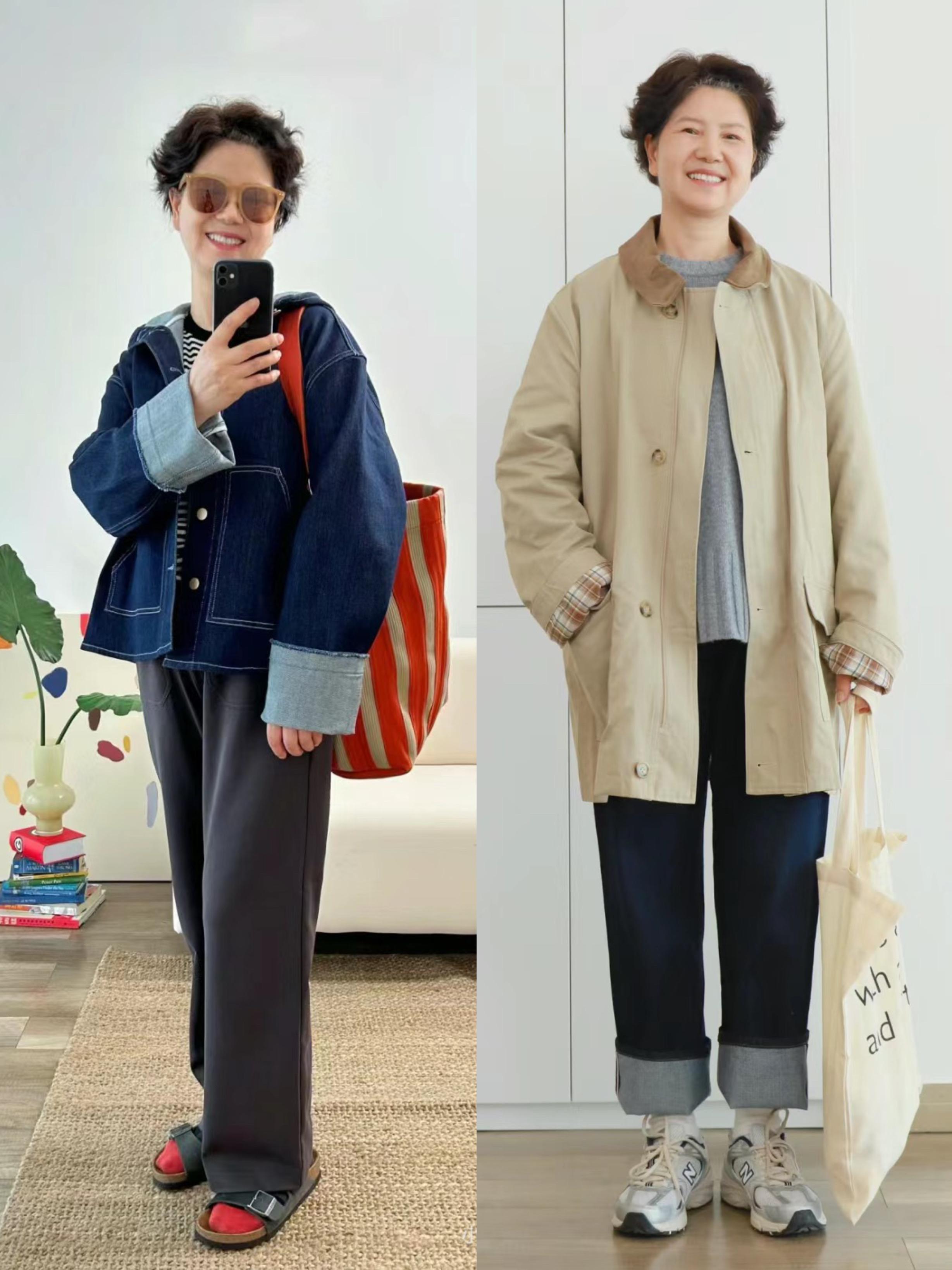其實女人到了五六十歲的年紀,中性風的外套可以在一定程度上弱化年齡感。比如牛仔外套、或者風衣外套,都更顯幹練美。