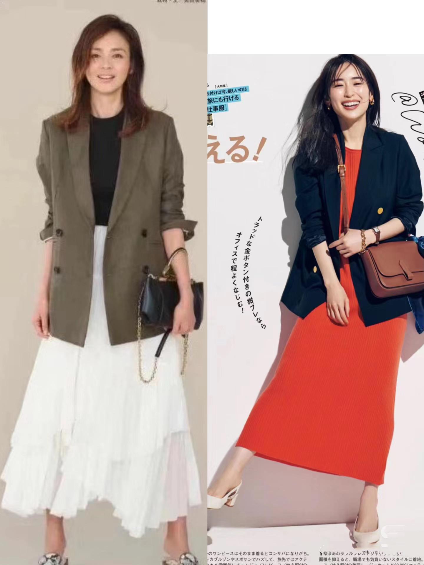 寬鬆的毛呢西服,配上白色半身裙,是明媚又大方的氣質。寬鬆西服搭一件紅色連衣裙,就更加明豔動人,掩蓋了年齡痕跡。