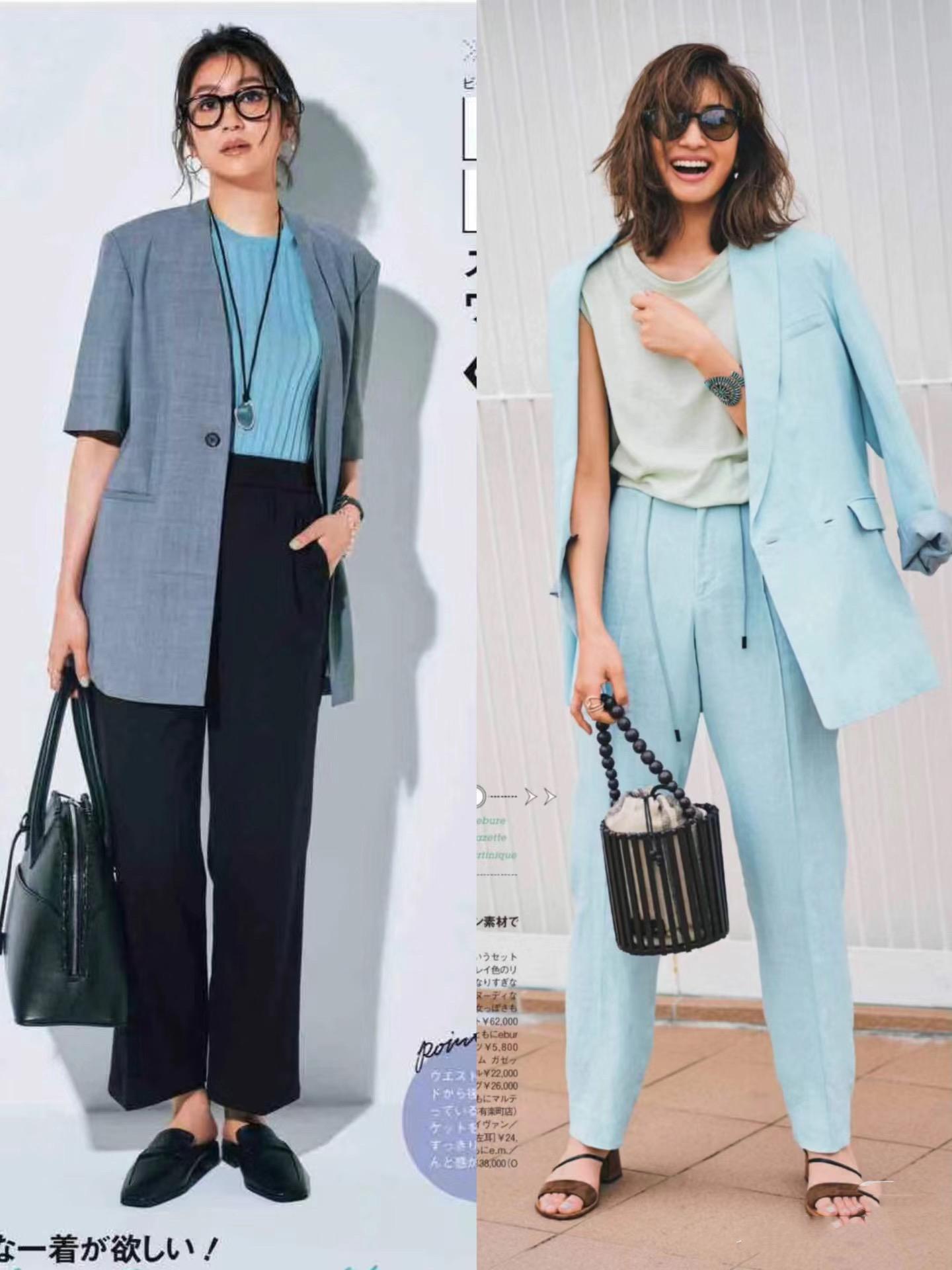 淺藍色系的西服套裝,配上同色系的內搭,整體氣質就更加溫和起來。色彩明亮但不過分耀眼,這種淺藍色系的穿搭,知性又時尚。