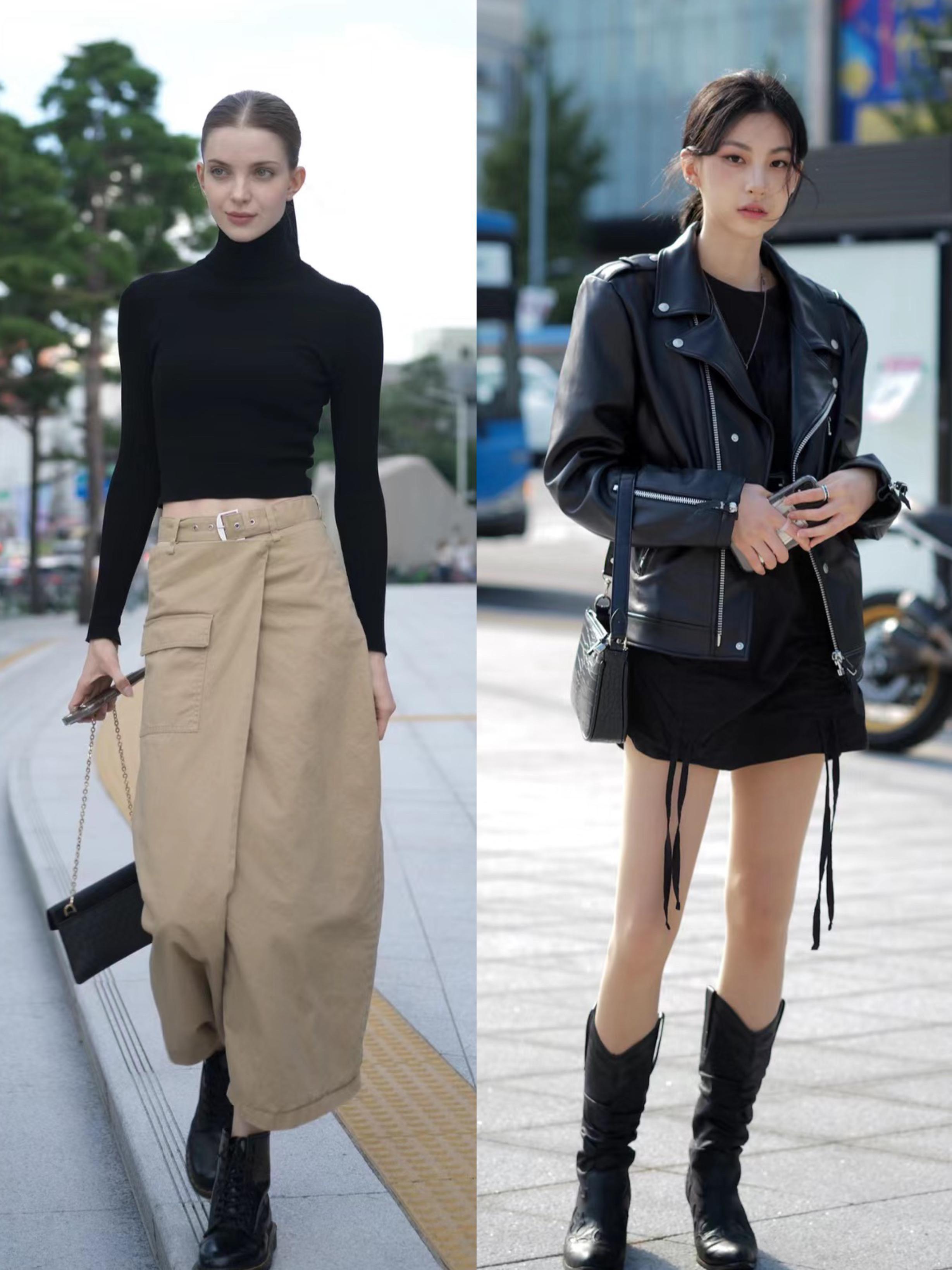 黑色皮衣外套,配V口的短靴,簡簡單單的就很顯腿長。不想穿得那麼規矩,就可以從酷颯、性感、洋氣等詞彙入手,讓我們的穿搭簡單又高級。