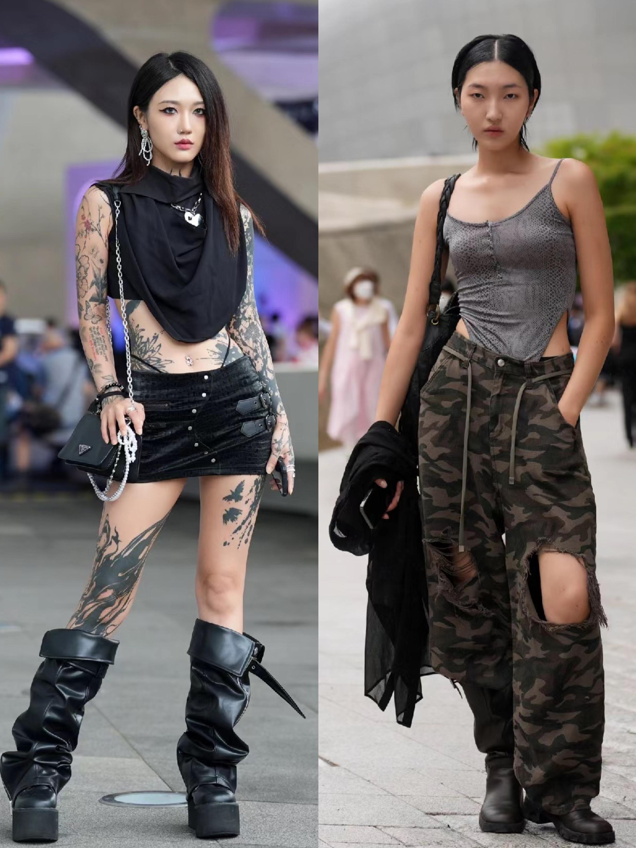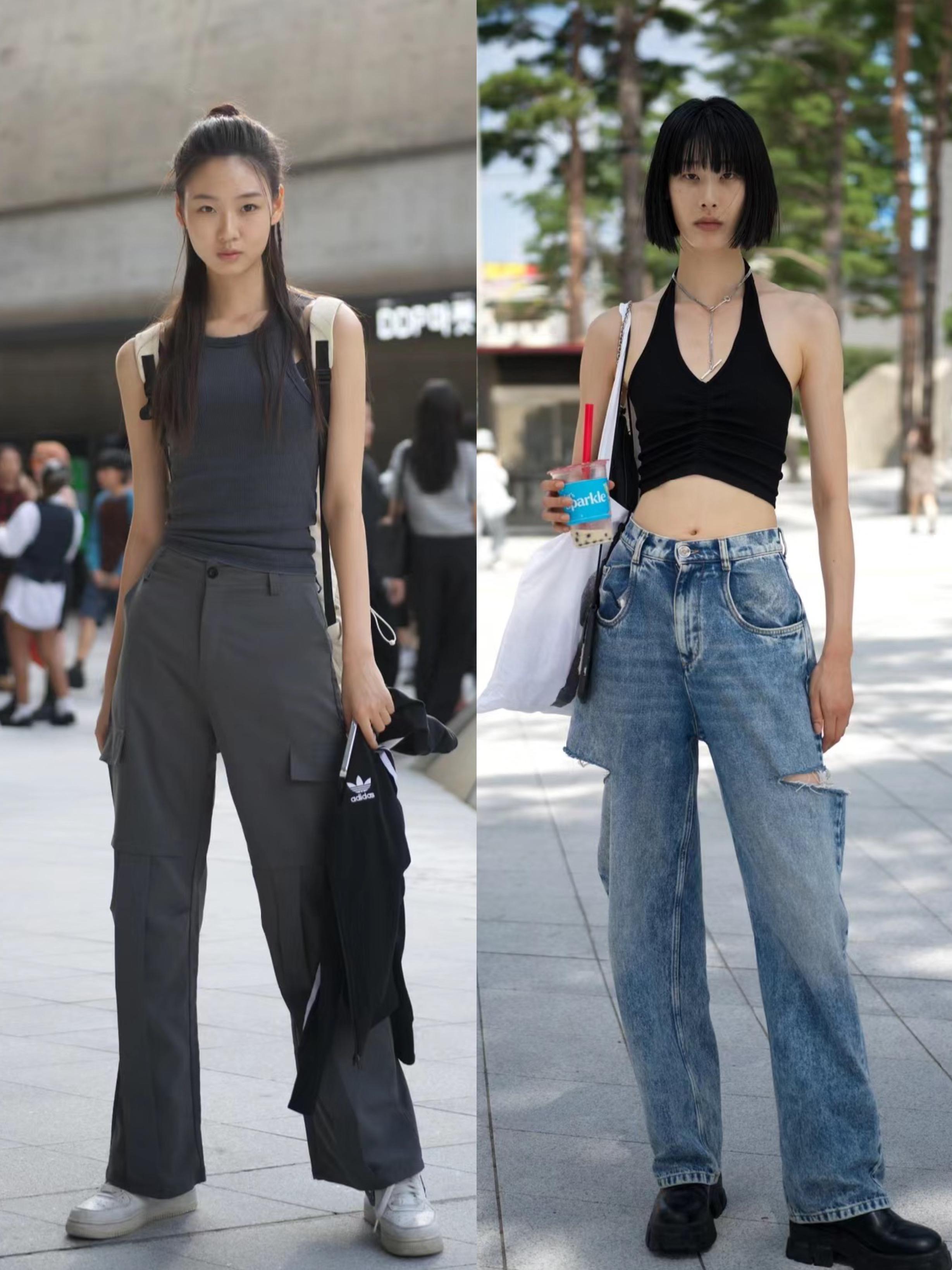 上短下長的組合,在首爾街拍中也非常常見。尤其是運動風的小背心、可以配高腰的直筒牛仔褲、或者工裝風的高腰褲,帶一點小性感或者狂野不羈。