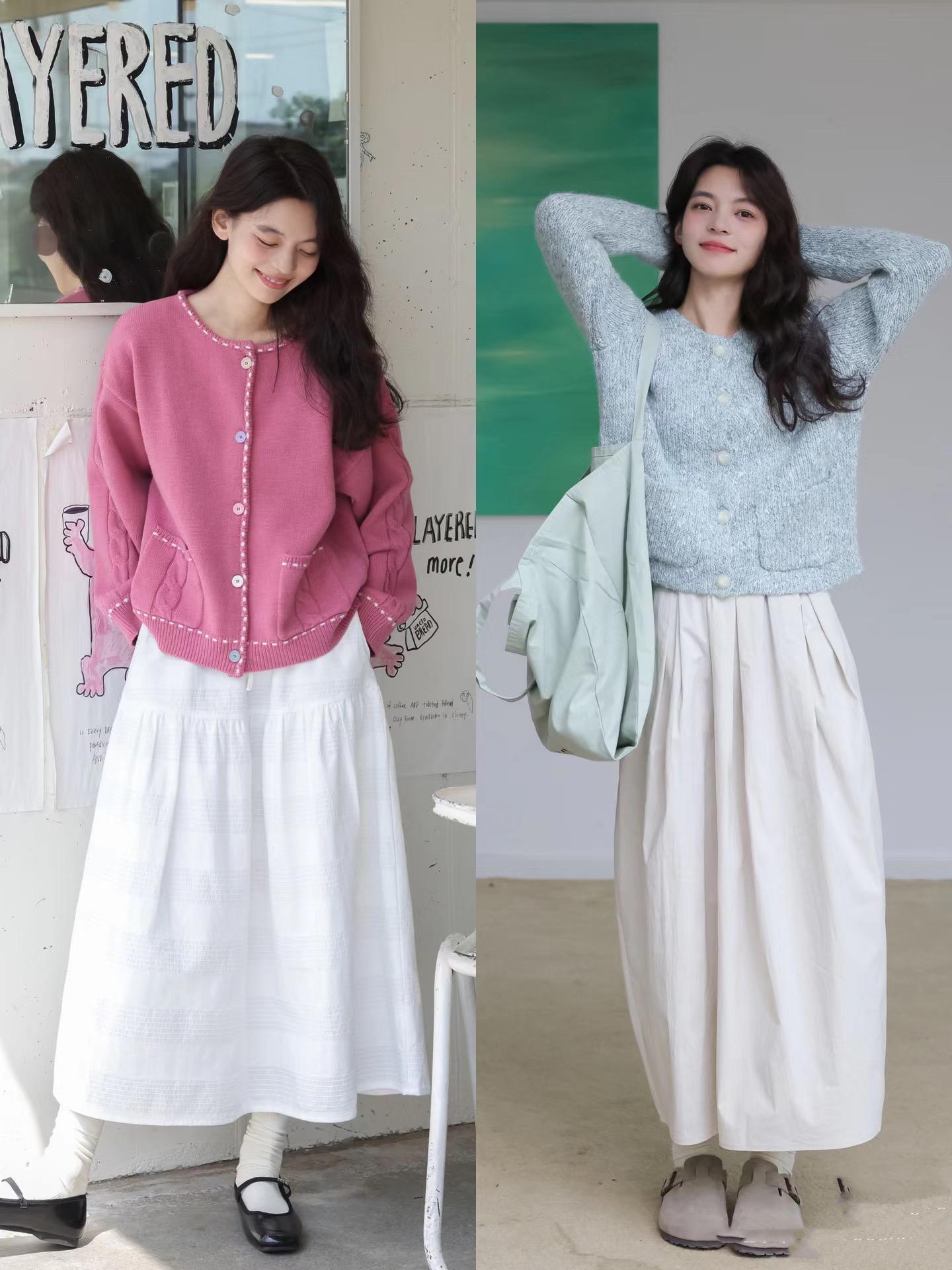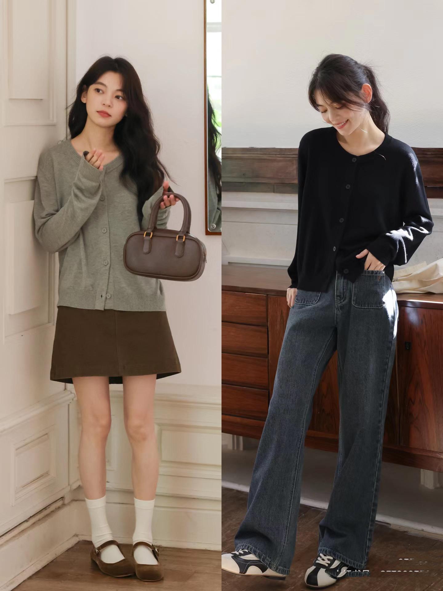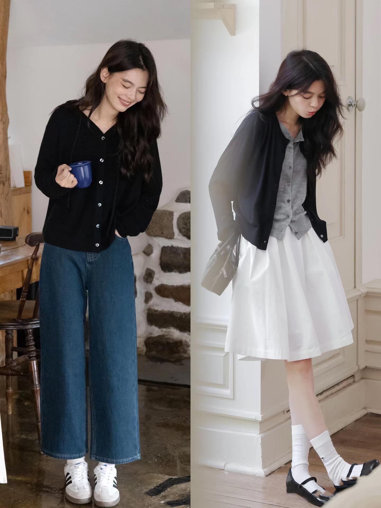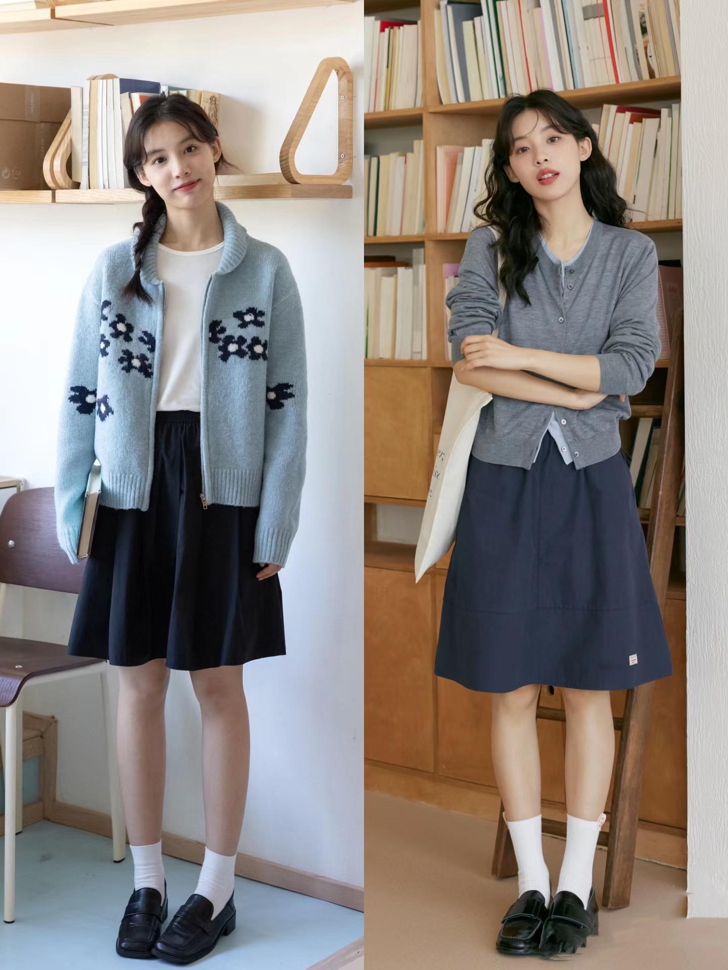 就像黑色針織衫,配深藍色直筒褲,淺灰色針織衫,配白色高腰半身裙。