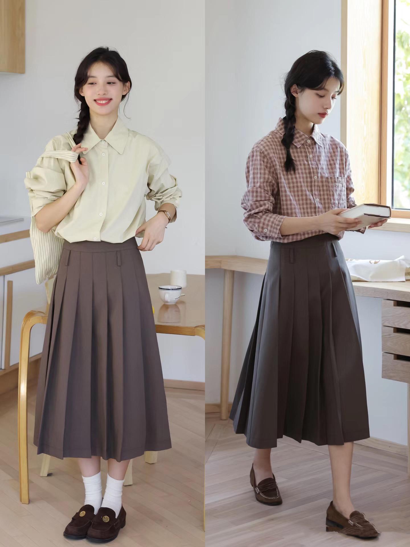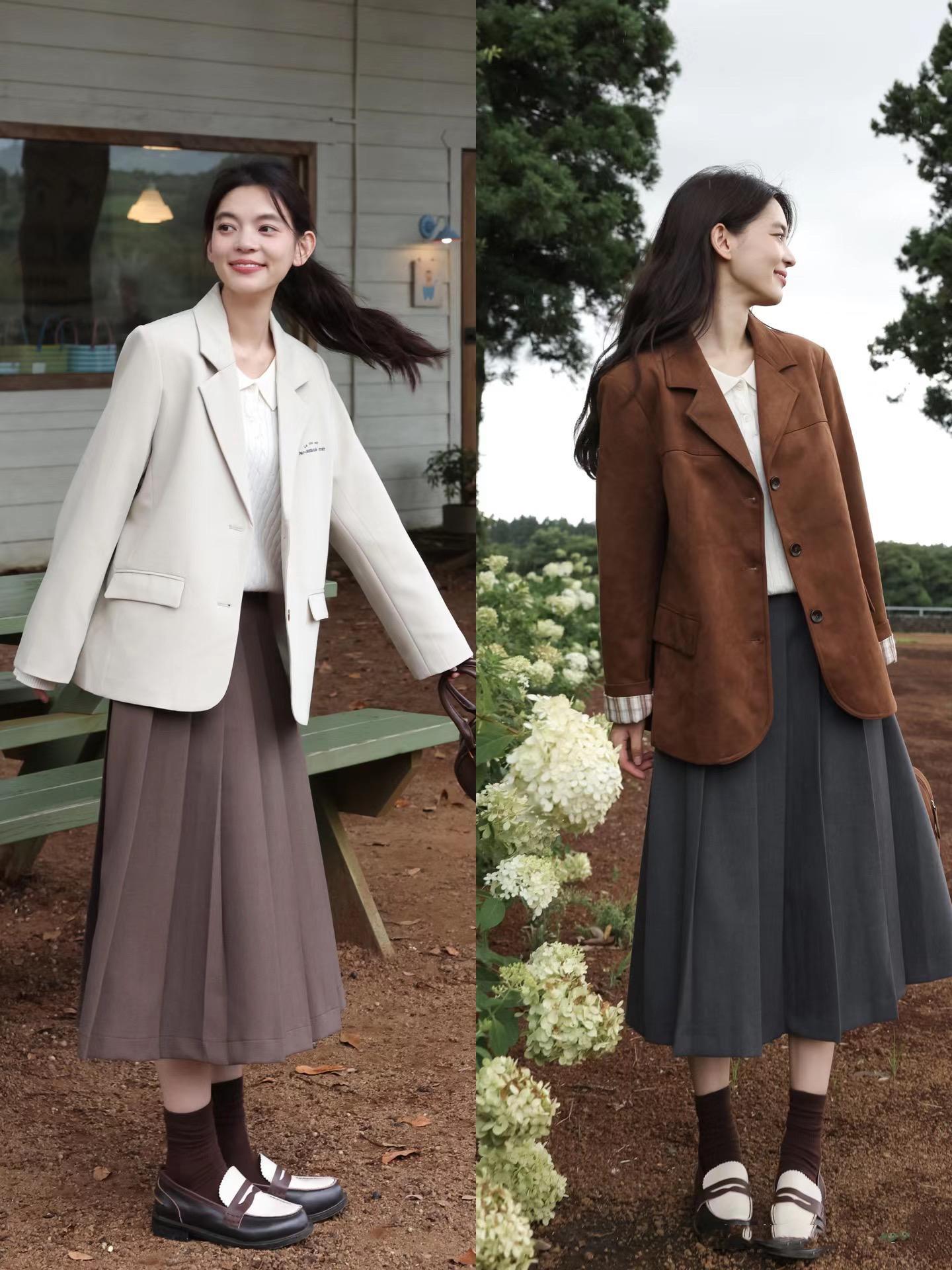 像這種針織衫+半身裙的搭配,露出小腿線條輕盈又活潑。一雙厚底的樂福鞋,配上白色小腿襪也很減齡,入秋後的厚底樂福鞋,隨便一穿就很顯高。