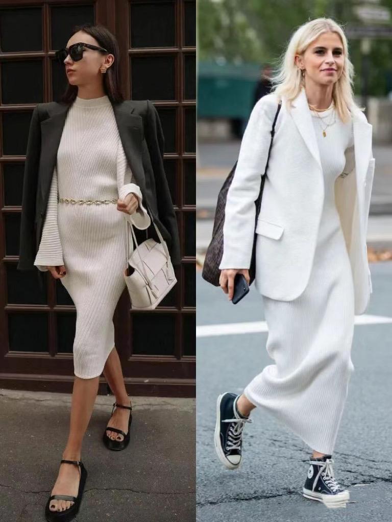 當我們穿修身針織連衣裙的時候,只需要配一件寬鬆的西服,就更加颯美有範。修身針織連衣裙,配同色系的寬鬆西服,更顯高級美。