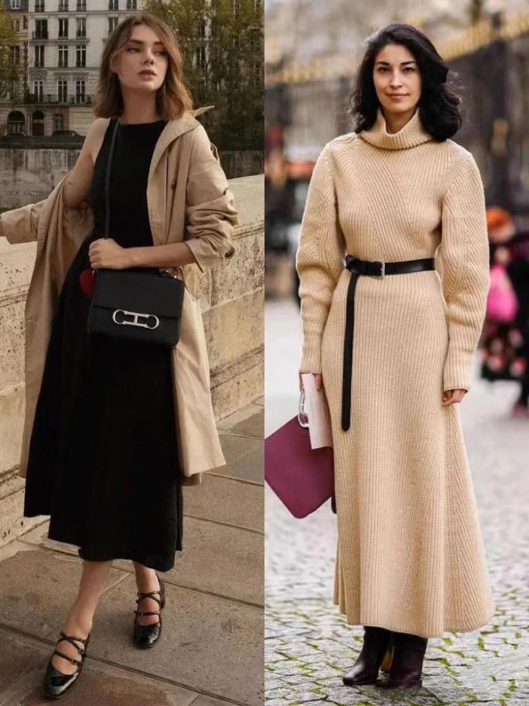 如果想要更時髦一點,就在寬鬆連衣裙上疊搭一條高級感的腰帶吧。比如卡其色針織連衣裙,配上黑色腰帶/皮帶,既精緻又霸氣。