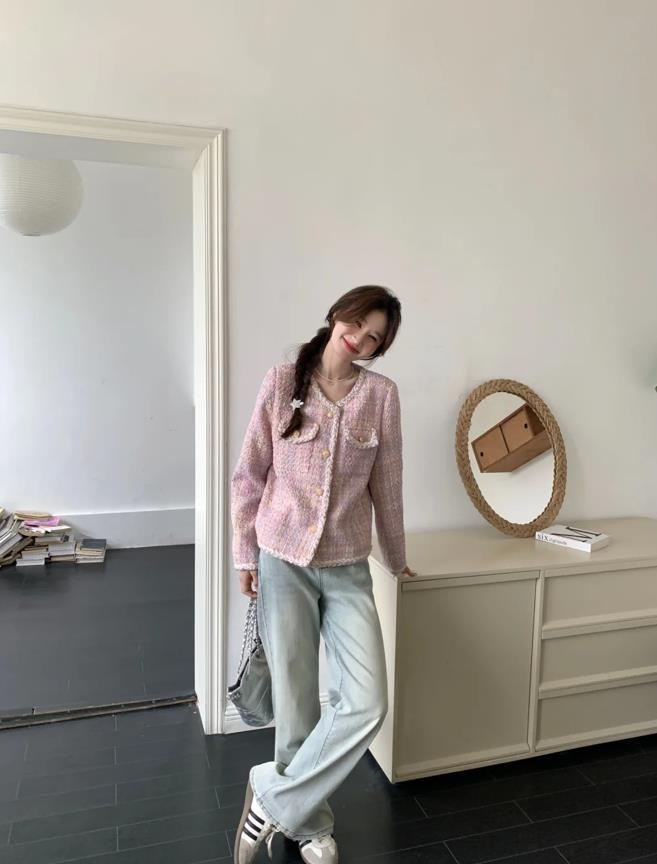 這一件低飽和度的小香風外套,顏色是粉粉嫩嫩的,看起來也太減齡和少女了吧?版型不是非常寬大,也沒有很修身,顯瘦效果絕佳,搭配水洗牛仔褲,很清爽乾淨的一套,腳下踩着一雙德訓鞋,休閒又舒適。