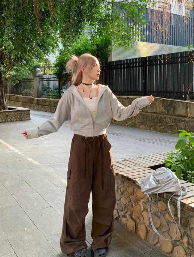 甜酷範十足的一套裝扮,淺灰色短款衛衣,太適合個矮的姐妹們穿了,簡簡單單的又非常好看,搭配棕色工裝褲,這種寬鬆的褲型,對腿型有着極佳的包容性,顯瘦效果絕了。