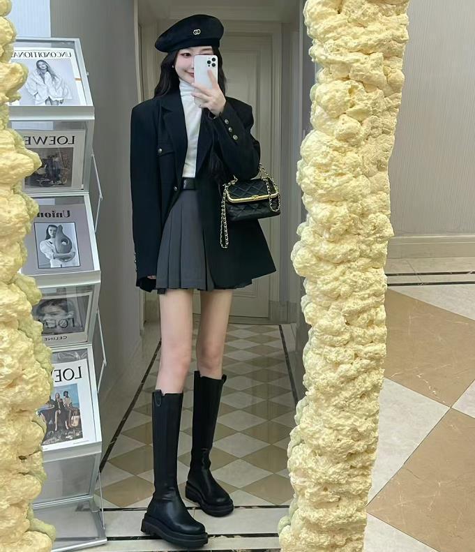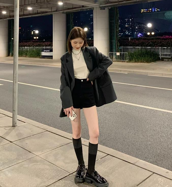 灰色的西裝,就是很百搭和經典,這個色系既沒有黑色那麼顯沉悶,又容易穿出高級感,秋天的時候,可以內搭一件白色的打底衫,這樣簡單的搭配也非常好看。下身搭配一條黑色短褲,加上一雙黑色中筒襪,很好增加了層次感,也可以搭配靴子,效果都是很不錯的。