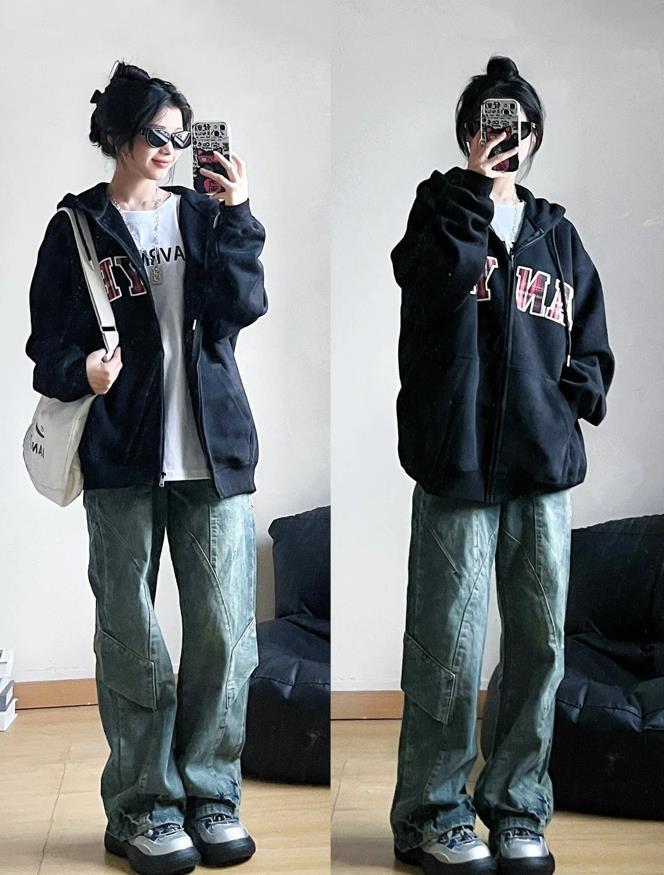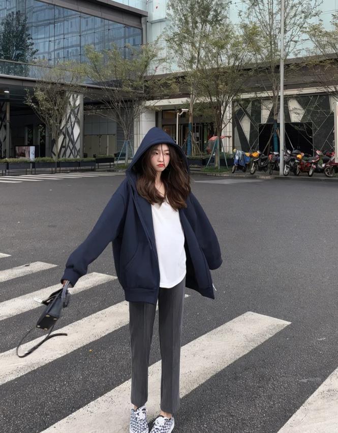 衛衣外套也是今年流行的外套之一,姐妹們,喜歡休閒風打扮的,就可以試試這一件,黑色拉鍊衛衣外套,寬鬆的版型,那真的是太藏肉顯瘦了。內搭白色打底,就很自然舒適和好看了,喜歡這種版型大大的,簡單配一條牛仔褲,美式風直接拉滿。