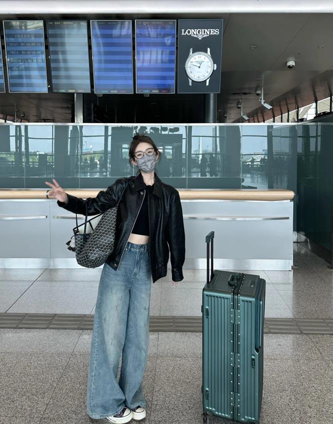 早秋這麼穿真的是絕了,黑色皮衣外套,這麼一件外套看起來就非常顯帥氣和個性,內搭一件黑色背心,就這樣把外套敞開來穿,可太性感了。下身選擇的是一條牛仔闊腿褲,顯瘦又藏肉。