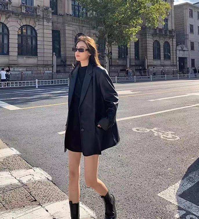 皮質的黑色西裝外套,穿起來可是多了幾分酷帥感,它的版型是寬鬆的,無論是休閒還是正式場合都能輕鬆駕馭。下身搭配牛仔褲或裙子都合適,小個子女生可以配短裙或短褲,這樣就能很好拉長腿部線條。
