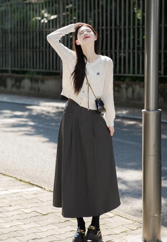 針織開衫也是進入秋天后衣櫥必備的,軟軟糯糯的材質,可舒適自在了,小短款的長度,最適合個矮的女生們了。搭配灰色半身長裙,上短下長的組合,能很好優化整個身材比例,顯腿長效果巨佳。