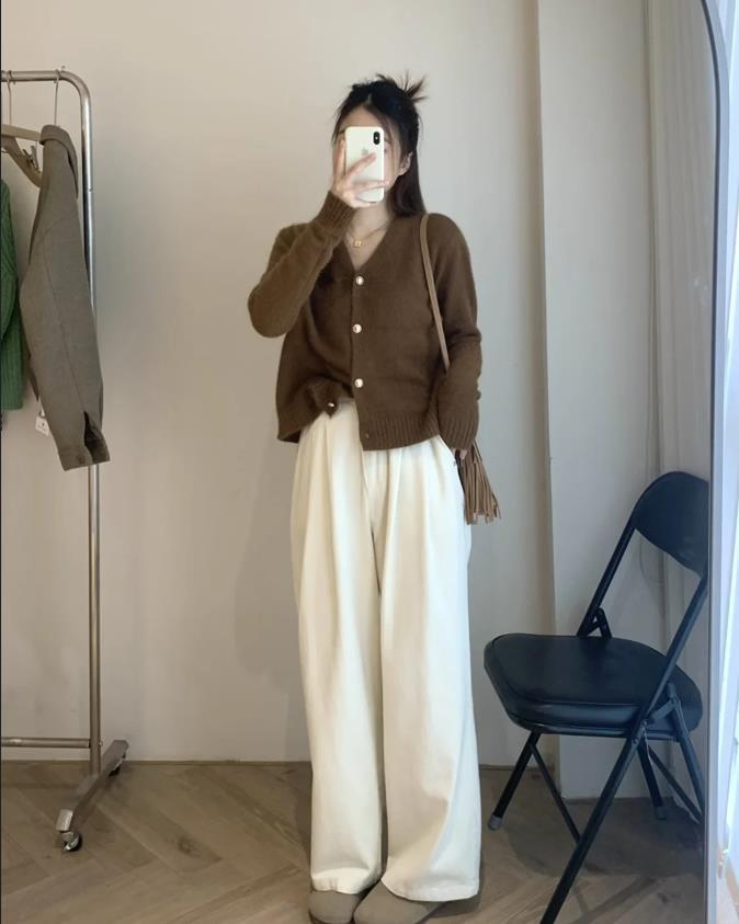 顯白效果極佳的一款咖色開衫,這個色調就是很適合入秋的季節,氛圍感直接拉滿,日常穿起來可舒服了,而且咖色真的很好看和顯白,版型是正肩設計的,加上是v領設計,穿起來一點都不臃腫,搭配奶白色休閒褲,清新元氣感十足。