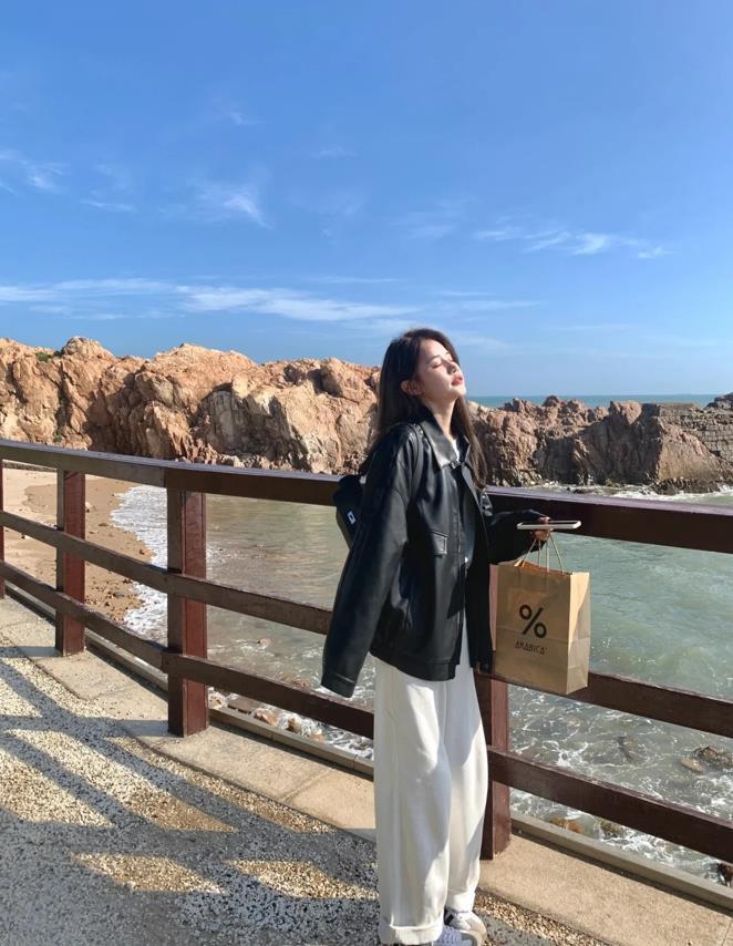 今年秋冬的第一件外套就選擇皮衣外套吧,小個子女生記得選擇這種利落的短款,能輕鬆穿出高挑感,下裝還是配了一條牛仔闊腿褲,很顯瘦藏肉和顯瘦。搭配一雙運動鞋,可舒適自在了,又帥又有範。