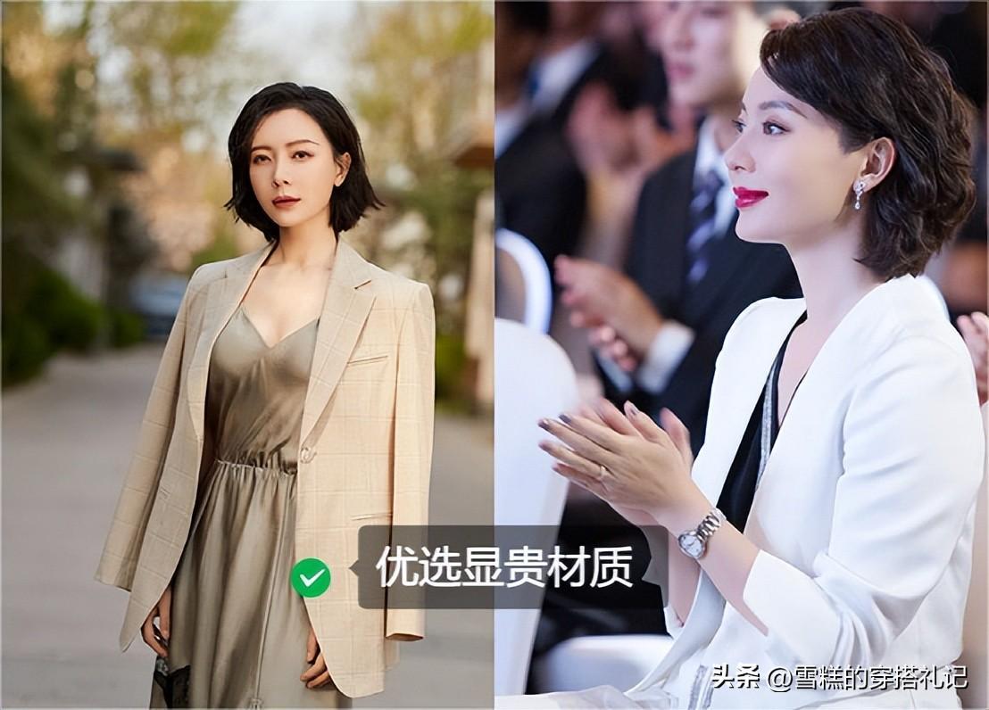 隨着年齡的增長,在挑選裙子時不僅要維護整體造型的高雅氣質,還需融入特色元素以凸顯個人風格,並強調"個性表達"。對於陳數而言將西服外套與帶有開衩設計的裙裝混搭在一起,成功調和了男性化的硬朗線條與女性特有的溫柔韻味。