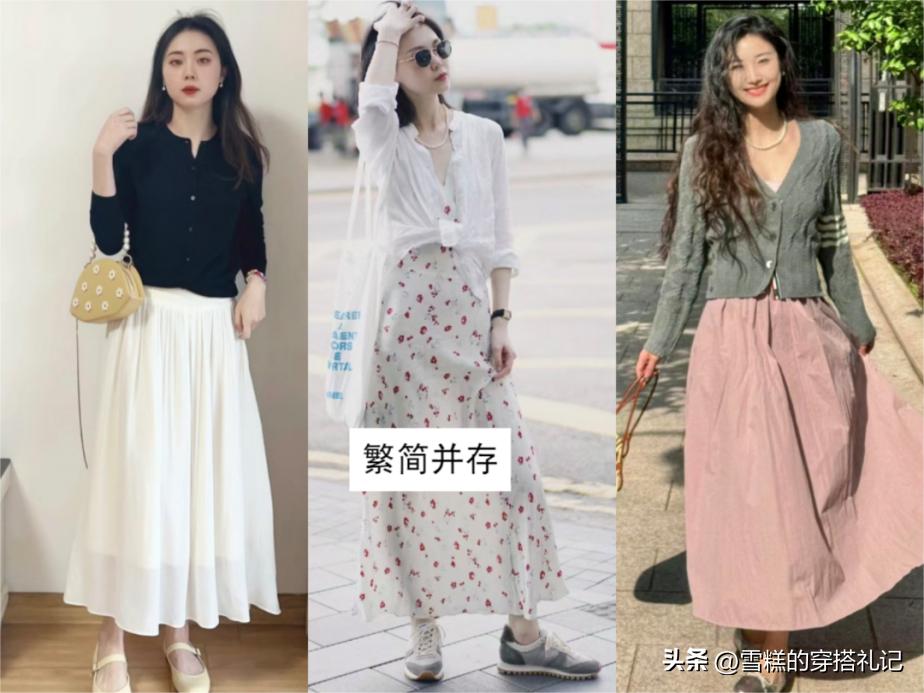 在選擇裙子搭配時,建議大家不妨跳出固有思維,少用高跟鞋作爲搭配單品,轉而尋求更爲百搭且舒適的選項。將腳踝部分恰到好處地展示出來,配合過膝的寬鬆長裙,既體現了女性的柔美與優雅,又不失個性與時尚元素。
