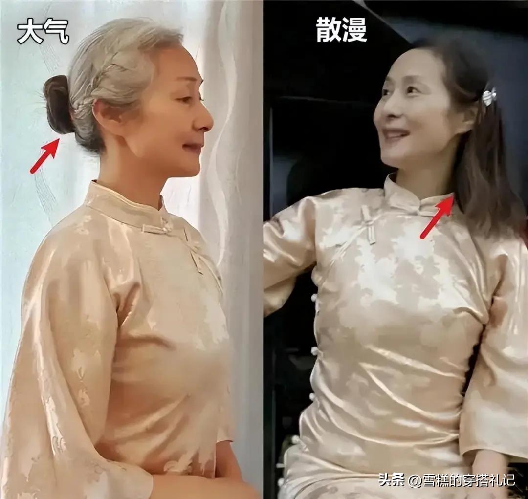上了年紀的女性,更追求端莊的氣質,這幾年極其流行新中式的旗袍風格,這樣的風格不僅體現在服飾,還要搭配適當的扎發造型。根據臉型和氣質優先推薦測盤發,通過將頭髮的上半部分盤起在後腦勺的一側,同時剩餘的頭髮披散在同一側的胸前。濃濃的典雅氣息就會撲面而來,結合旗袍等新中式的服飾會更加有魅力哦~