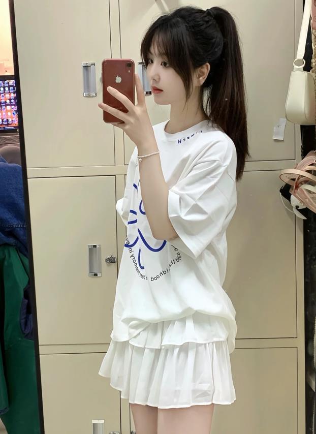 高馬尾+法式劉海,這樣一款髮型看起來也太減齡和青春了,少女範十足,白色短袖t恤+白色百褶短裙,同色系的組合,也太顯時髦和高級了。高高紮起來的馬尾,青春範十足,小個子女生也是可以駕馭的。