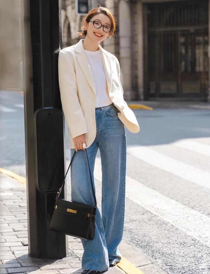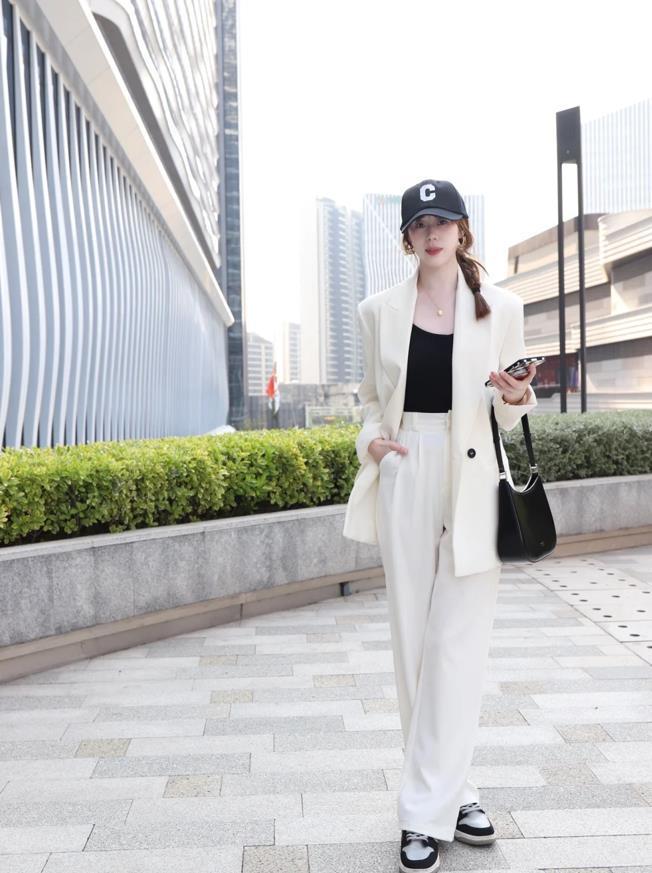 奶油白色西裝外套,這個色調看起來也太溫柔了吧,內搭白色基礎款t恤,簡單舒適又休閒,選擇一條淺色闊腿褲來配,整個人看起來就很清爽,小個子女生在穿這種褲子時,記得要把腰線給提高起來。