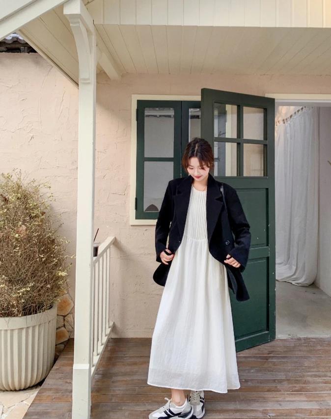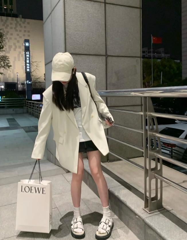 黑色西裝配小白裙,這真的是很適合秋天的穿法啊,高級感十足,這一套極簡風的搭配,可通勤可約會逛街,內搭的小白裙,哪怕是把外套脫掉也很美,有種法式風的美感,增加一雙運動鞋,可休閒好看了。