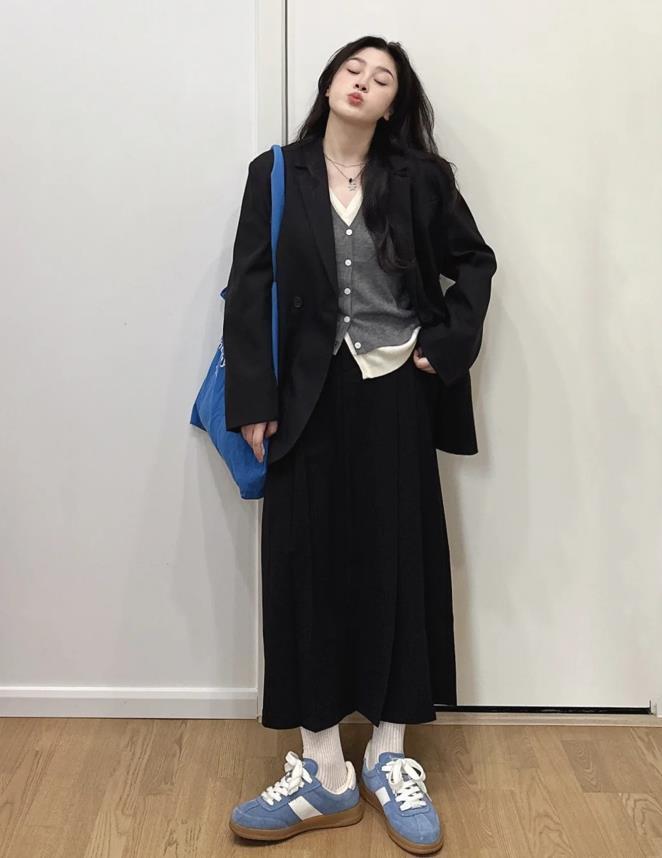 西裝真的是怎麼穿都不會出錯啊,這件黑色西裝外套,可太時髦百搭了,寬鬆的版型,十分藏肉和顯瘦。小個子女生穿這種大外套也是很讚的,自帶鬆弛感,一秒就可以把造型氛圍感拉滿,內搭襯衫+t恤疊穿,很好增加層次感,腳下踩着藍色運動鞋,和襯衫顏色一致,和諧度滿滿。