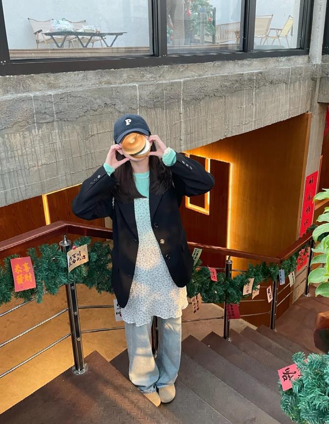 黑色西裝外套+疊穿,下身配的是一條淺色牛仔褲,整個着裝看起來也太韓了吧,好適合小個子女生的一套,看似有些不倫不類的,實際上卻很時髦。休閒舒適又好看。