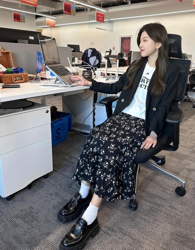 真的是很喜歡秋天,黑色西裝+碎花裙,這樣的搭配真的是絕配啊,上簡下繁的組合,輕鬆增加了層次感,也不失女性的柔美。西裝裏面搭配了一件白色t恤,爲整個着裝增添了幾分休閒感,不管是通勤,還是日常逛街都可。