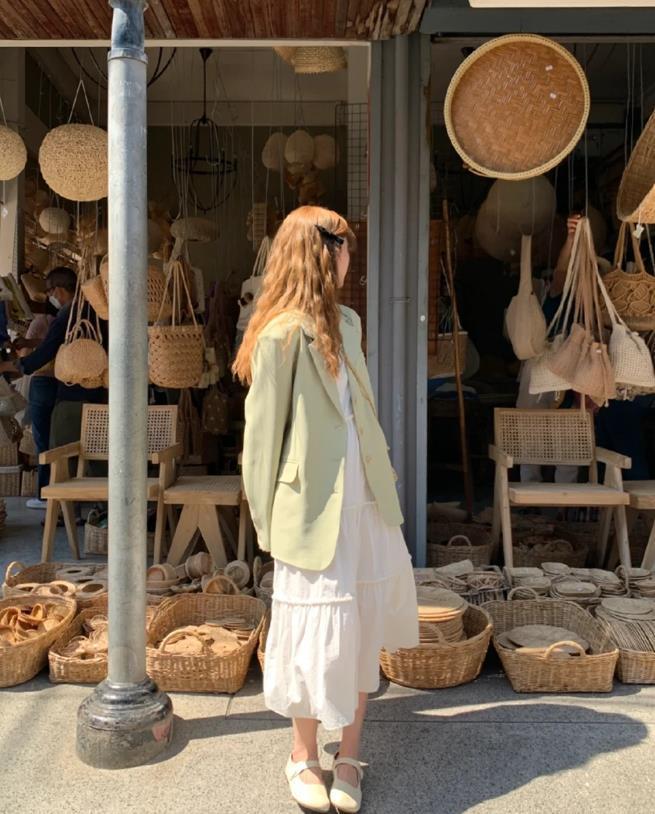 路人看了都覺得美的一套穿搭,薄荷綠西裝外套+白色仙女裙,整個着裝看起來也太美了,寬鬆的版型,那真的是藏肉與顯瘦。又減齡又不失氣質的一套,不管是上班還是約會都可以。