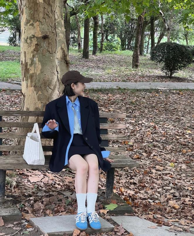 關於西裝的穿法,其實真的有很多,灰色西裝+藍色襯衫+t恤,這種撞色的疊穿也太好看了,可以增加整個造型的層次感,下身搭配半裙,或者是短褲都是可以的,特別適合小個子女生的穿法,能在視覺上輕鬆實現高挑感。