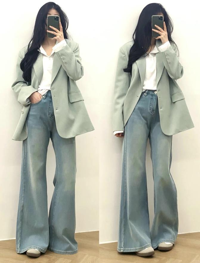 都覺得西裝這樣的外套,很容易穿出呆板和嚴謹感?那麼你可以試試這一件薄荷綠西裝外套,首先這個色調就很襯膚色,顯氣質又溫柔。完全不挑膚色的,哪怕你是黃黑皮都可以輕鬆駕馭。內搭白色襯衫,加上一條微喇直筒牛仔褲,腳下一雙德訓鞋,舒適極了。