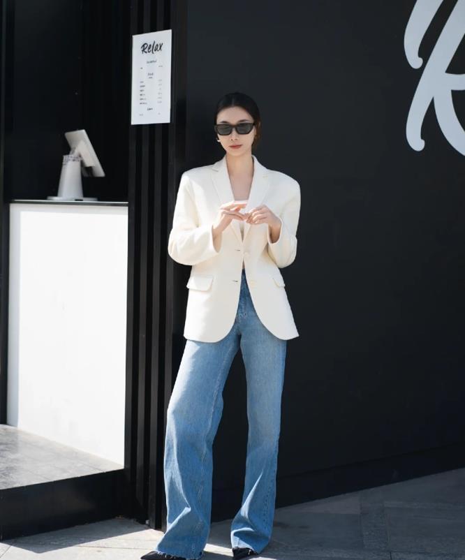 簡單即高級,乾淨的白色西裝外套,可百搭時髦了,像這種版型寬鬆,又簡約的西裝外套,沒有誰會拒絕的吧?選擇一條牛仔褲來配,又美又颯,腳下踩着一雙尖頭高跟鞋,大女人風範就出現了。