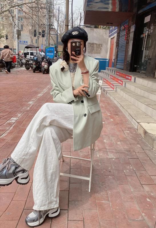 薄荷綠色的西裝,這個色調看起來也太顯白了,加上寬鬆的版型,那真的是非常顯瘦和休閒呢,搭配白色休閒褲和運動鞋,減弱了屬於西裝的呆板和嚴謹,整個配色是淺綠+白色的,給人的感覺就是很清新。