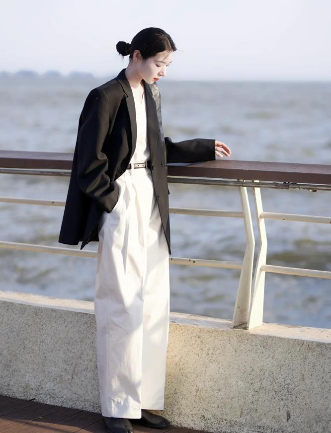 極簡風的搭配,誰會不喜歡呢?黑色的西裝外套,怎麼都穿不膩,寬鬆的版型,對身材具有極佳的包容性,顯瘦藏肉效果都極佳。內搭和下裝都選擇了白色,同色系的組合真的太高級了,白色寬鬆休閒褲,讓穿搭多了幾分休閒感。