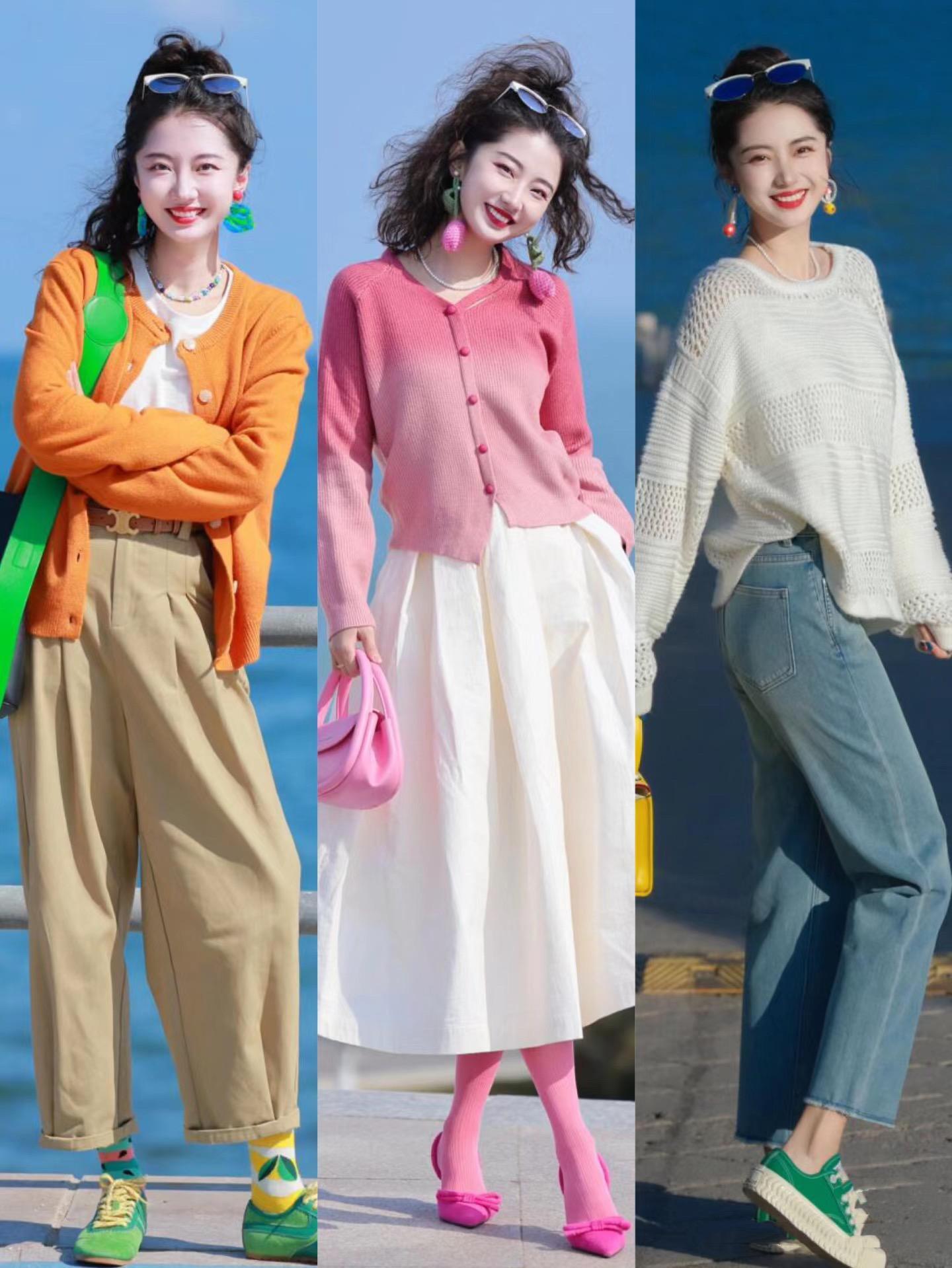 明亮色的針織衫、配基礎色的闊腿褲,清爽又顯白