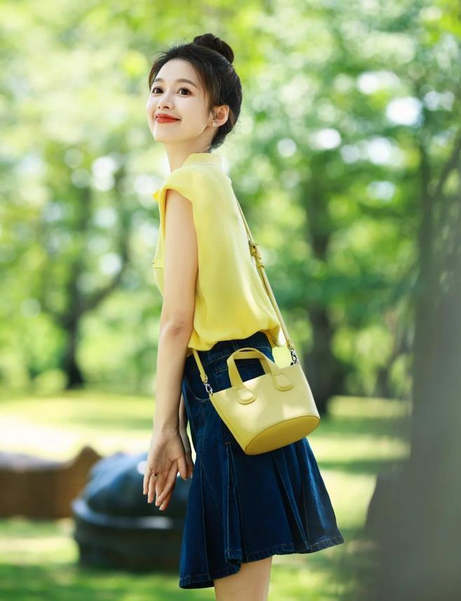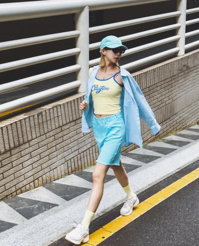 多巴胺海鹽風直接拉滿,天空藍襯衫配冰川藍短褲,深淺不一的搭配,組合在一起,也太顯層次了,襯衫的內搭選擇了奶黃色吊帶,腳上還選擇了一雙淡黃色中筒襪,輕鬆增加了層次,也豐富了整個着裝造型,整體看起來清新又充滿元氣。