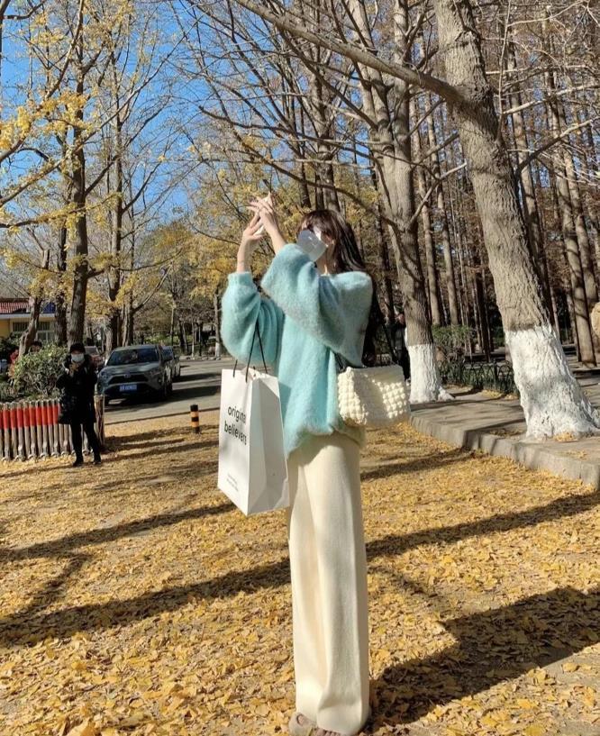 冰川藍這個色調不僅僅適合在夏天,入秋後也是可以運用起來,低飽和度的配色,那真的是太不挑膚色了,可以把你的膚色襯托得很白嫩。寬鬆的冰川藍毛衣,對身材一點約束感都沒有,搭配同樣寬鬆的闊腿褲,一套鬆弛又顯隨性。