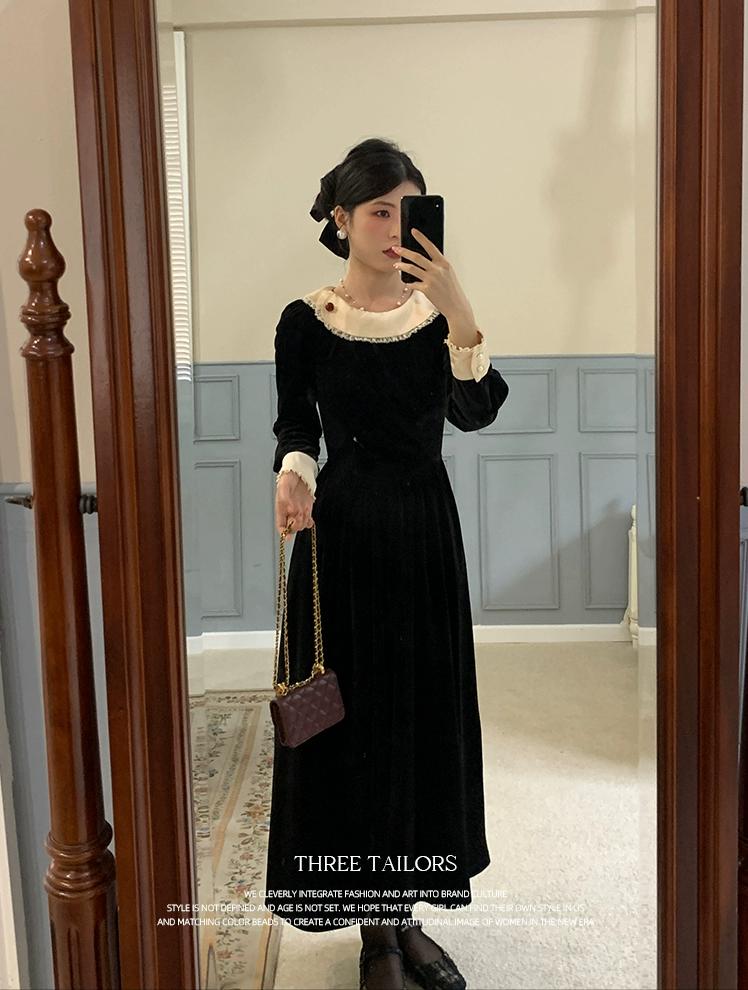 復古優雅黑色絲絨長款連衣裙