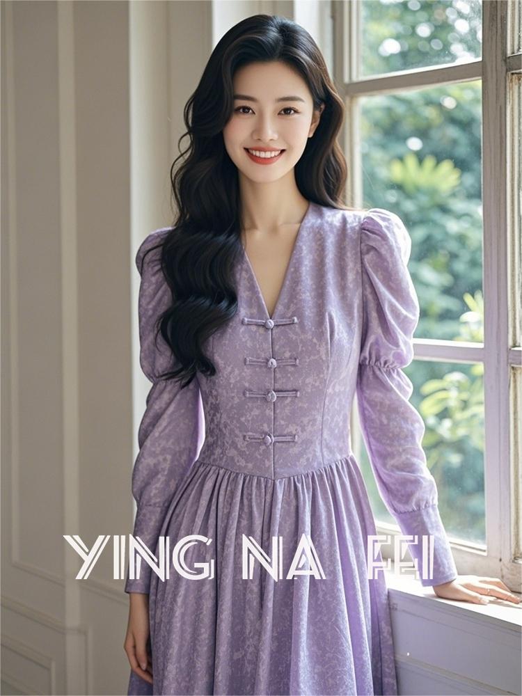 紫色印花V領盤扣連衣裙