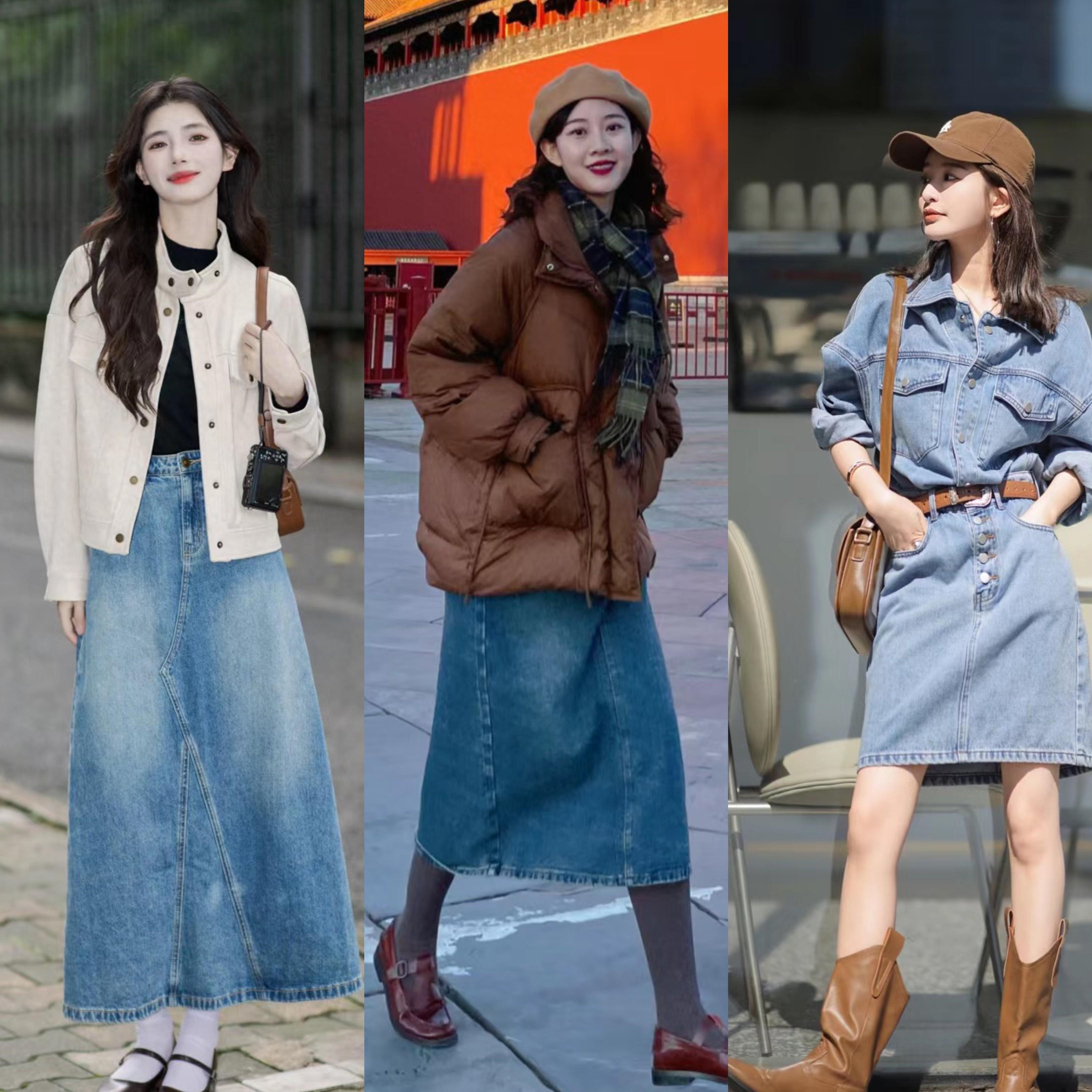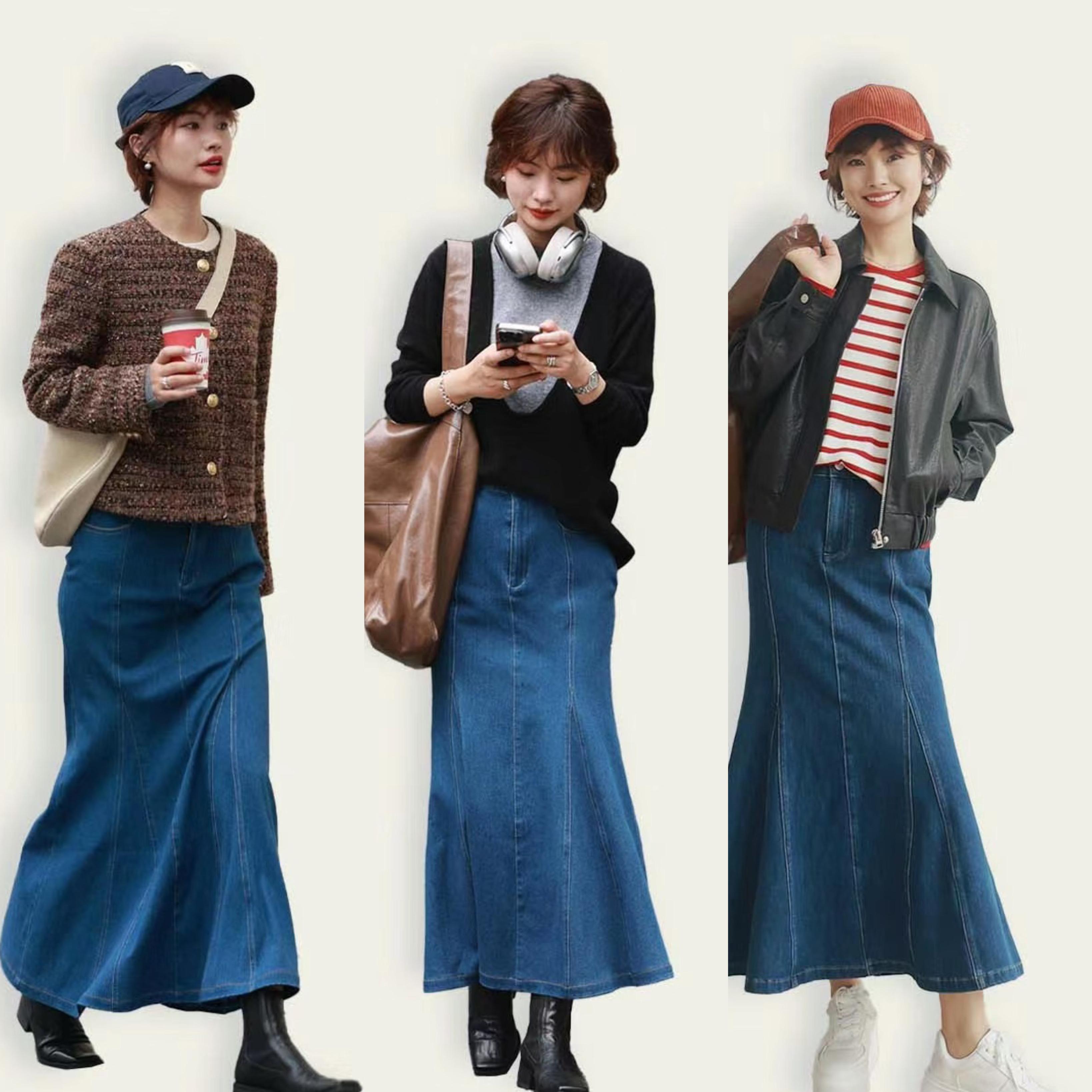 秋天裏的牛仔半身裙,以過膝及踝款爲主。版型上,更推薦大家選擇H型或者A字型,不僅垂順性更強、也能遮胯顯瘦,起到一種保暖顯高還洋氣的視覺效果。