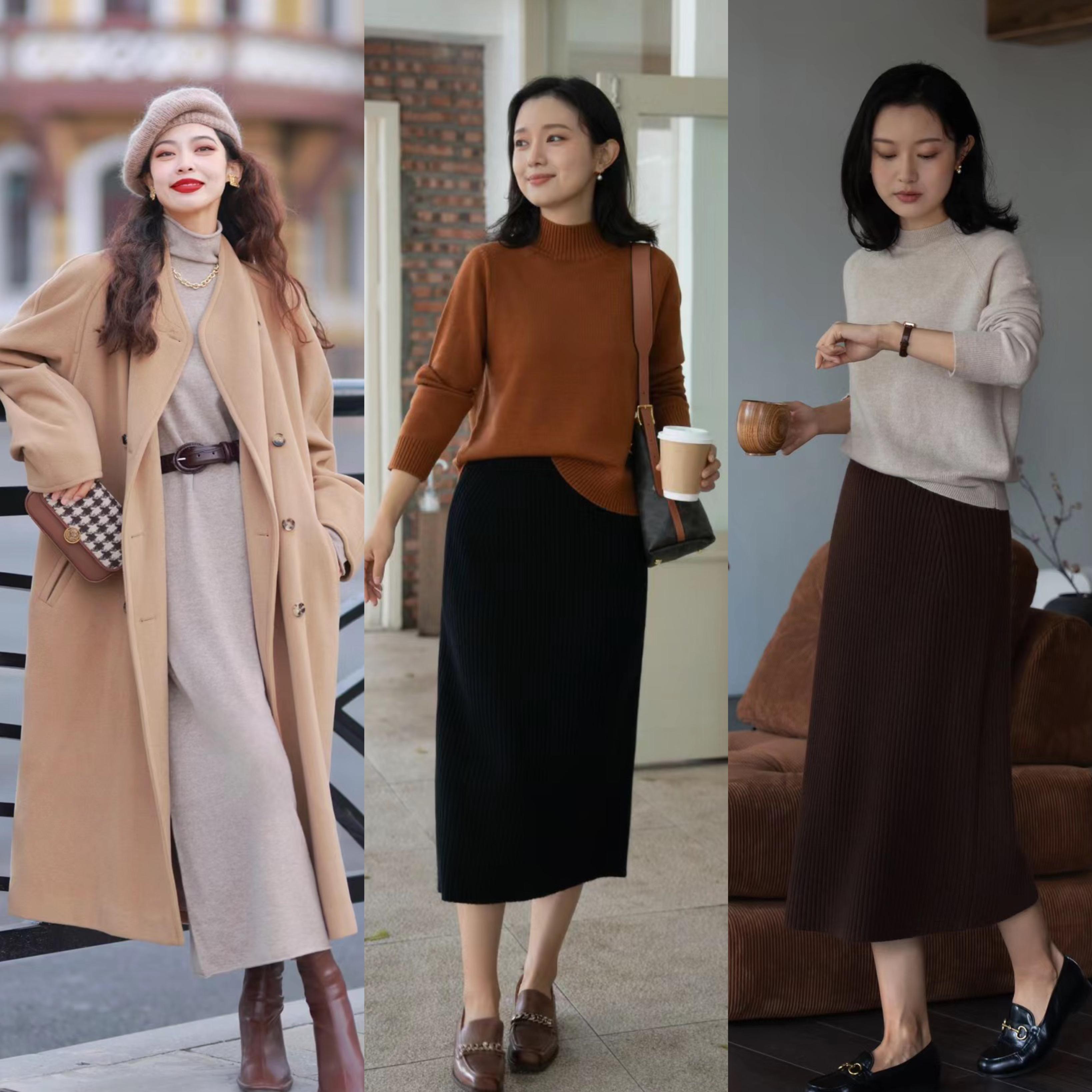 我們穿毛呢半身裙,可以配慵懶的針織衫,營造那種自然舒適的氛圍。天冷的話,還可以搭一雙連褲襪、或者過膝長靴,優雅而從容。