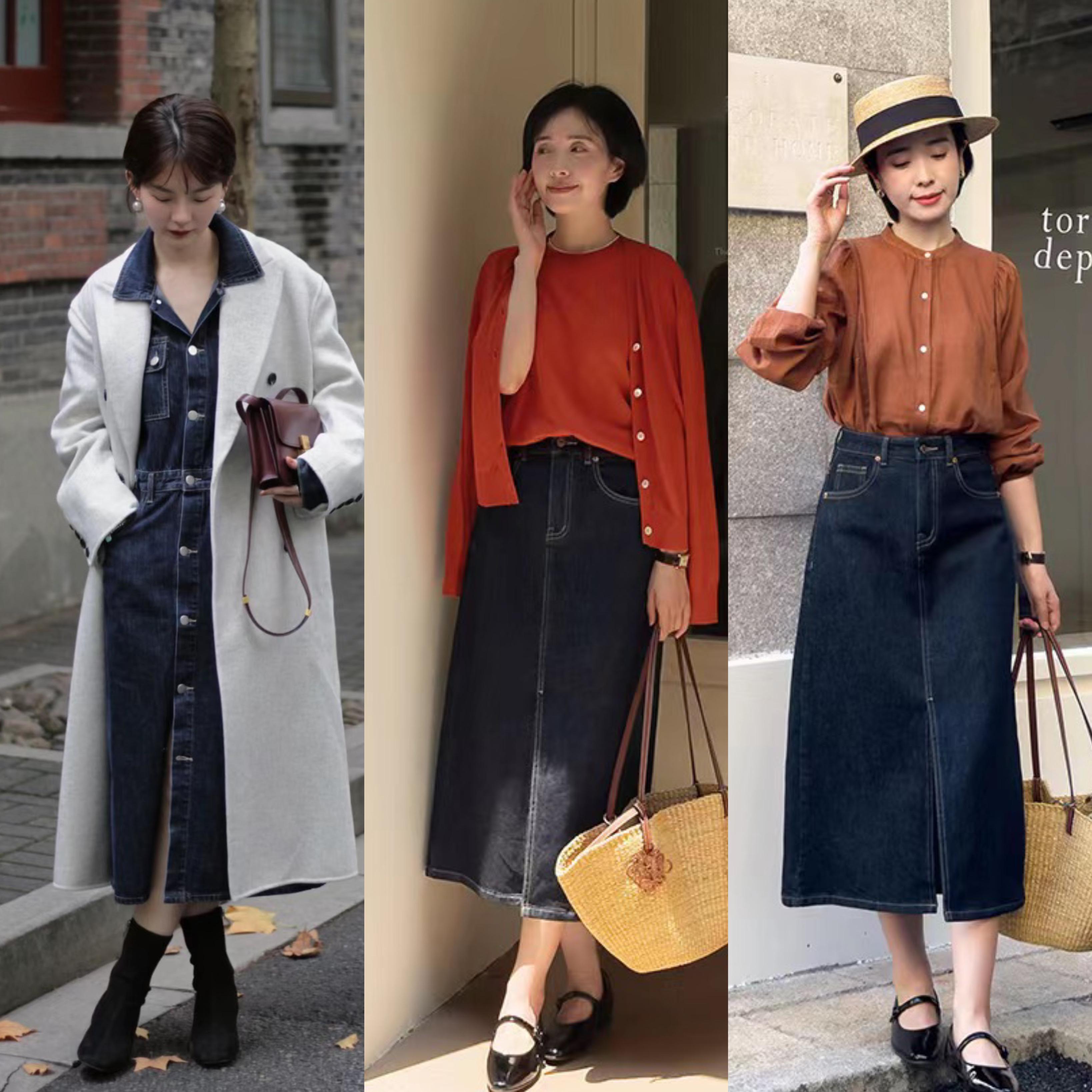 藍黑色的牛仔半身裙,是一種相對內斂、更加顯瘦、也更爲優雅的款式。對於40+的成熟女性來講,更值得選擇。