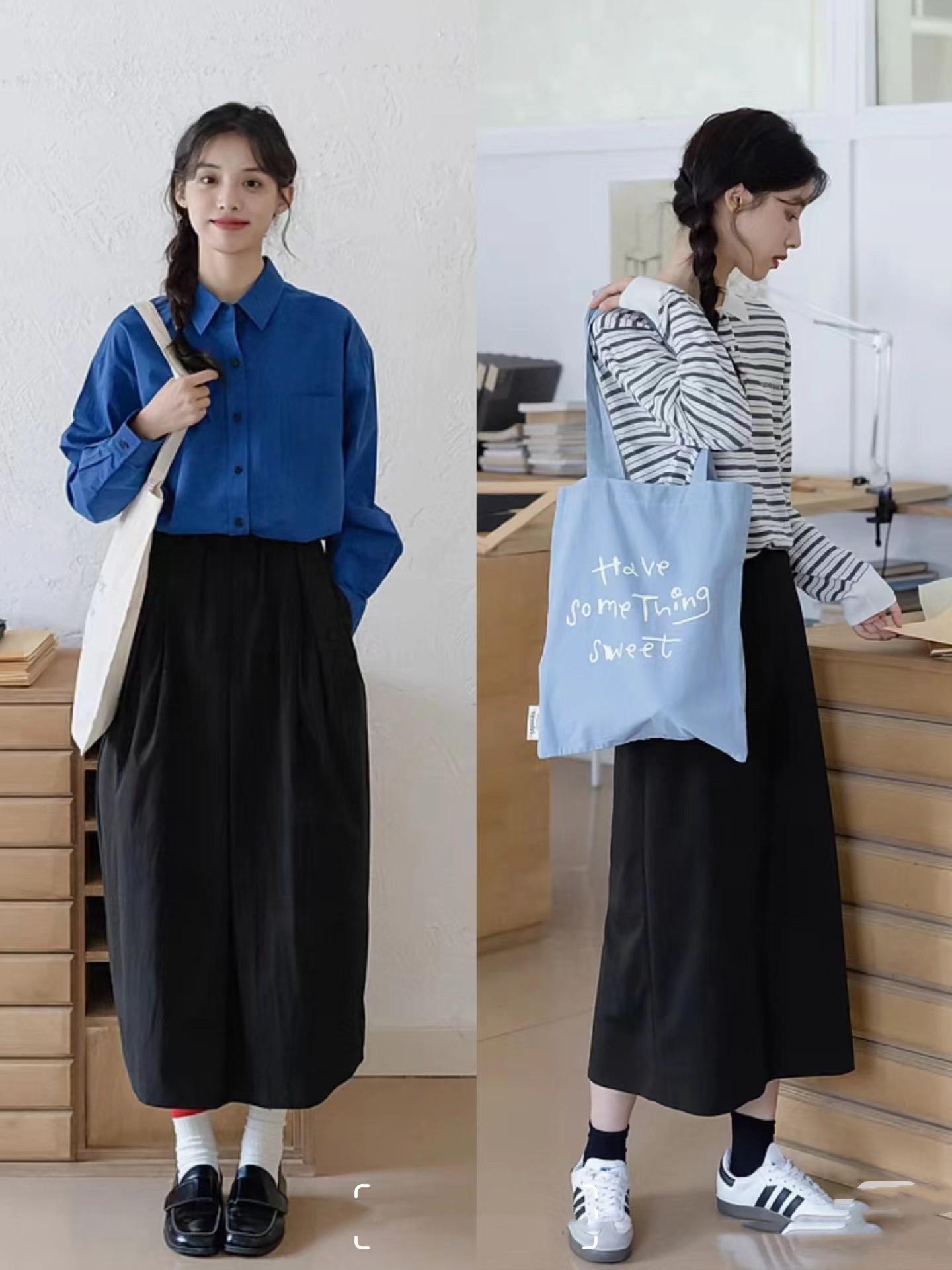我們穿黑色半身裙,可以配黑色樂福鞋,也可以搭黑色中筒襪,都實現了縱向比例的延伸。黑色半身裙,配黑色樂福鞋,復古文藝、也是很有辨識度。