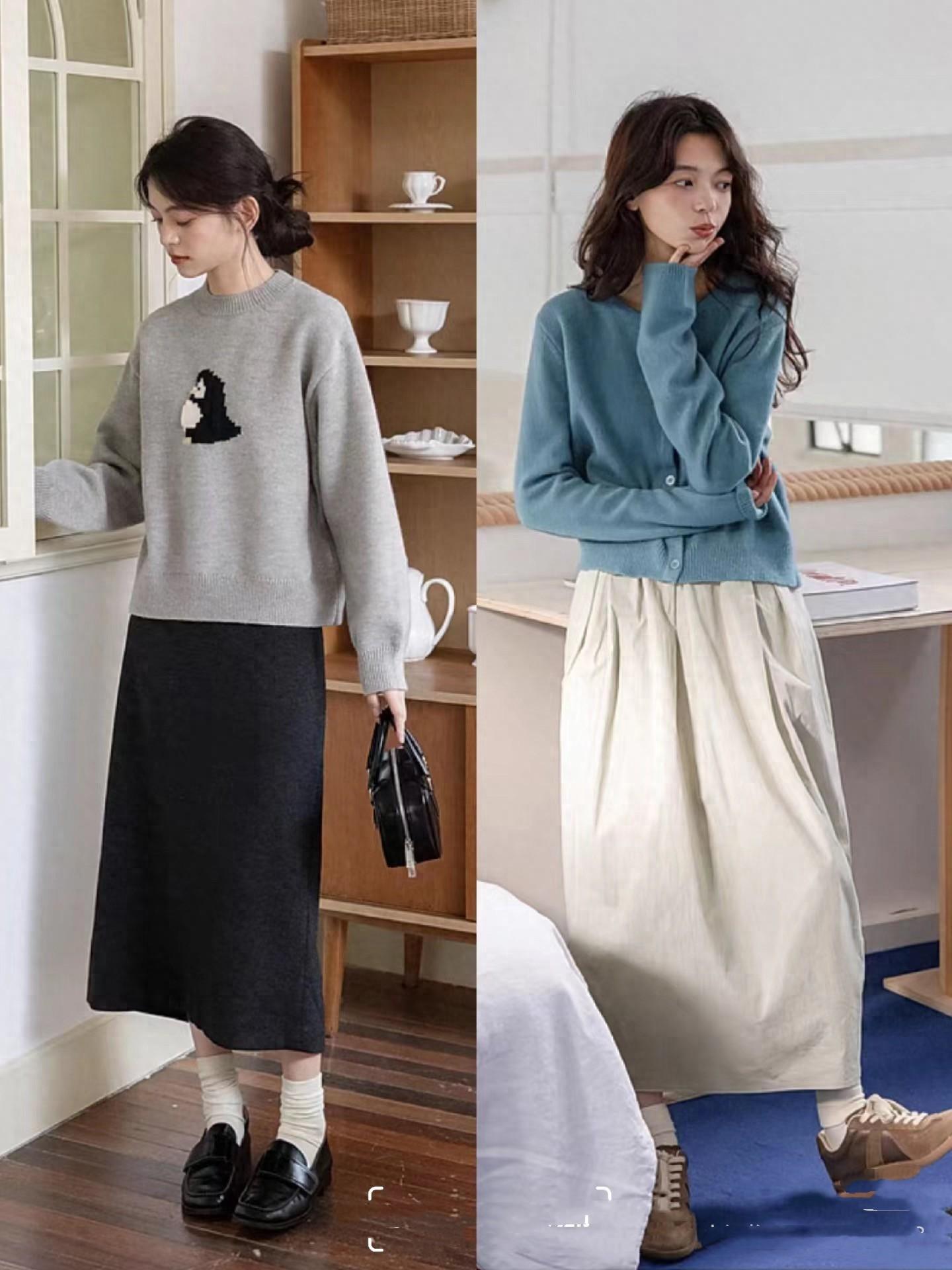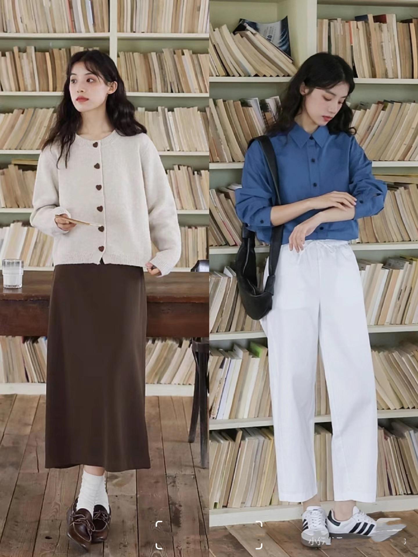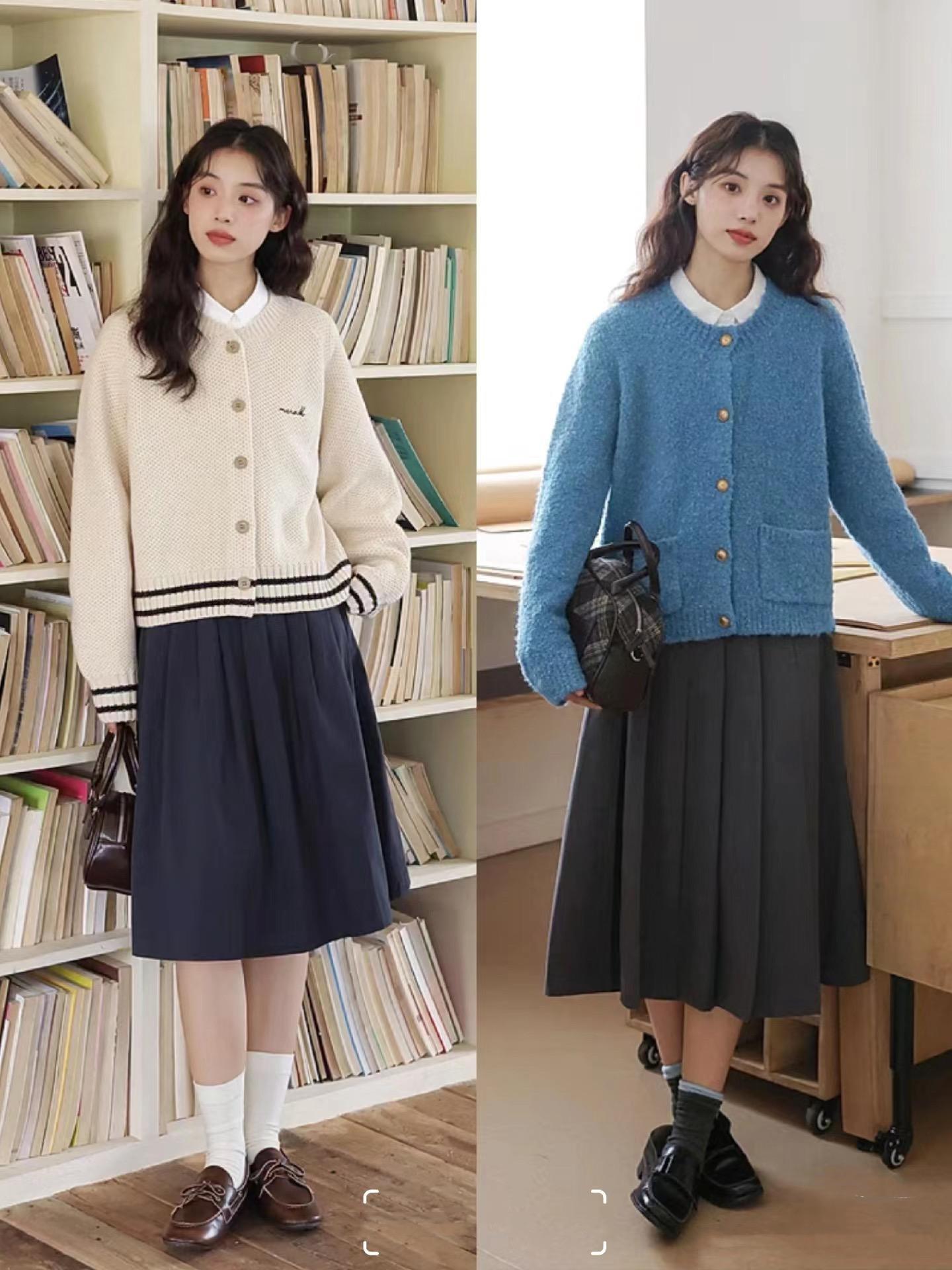文藝風的針織衫,疊搭白色襯衫,配淺卡其色的半身裙,搭白色中筒襪,露出纖細的小腿,也是學院風十足。小個子女生這樣穿,真的太減齡了。