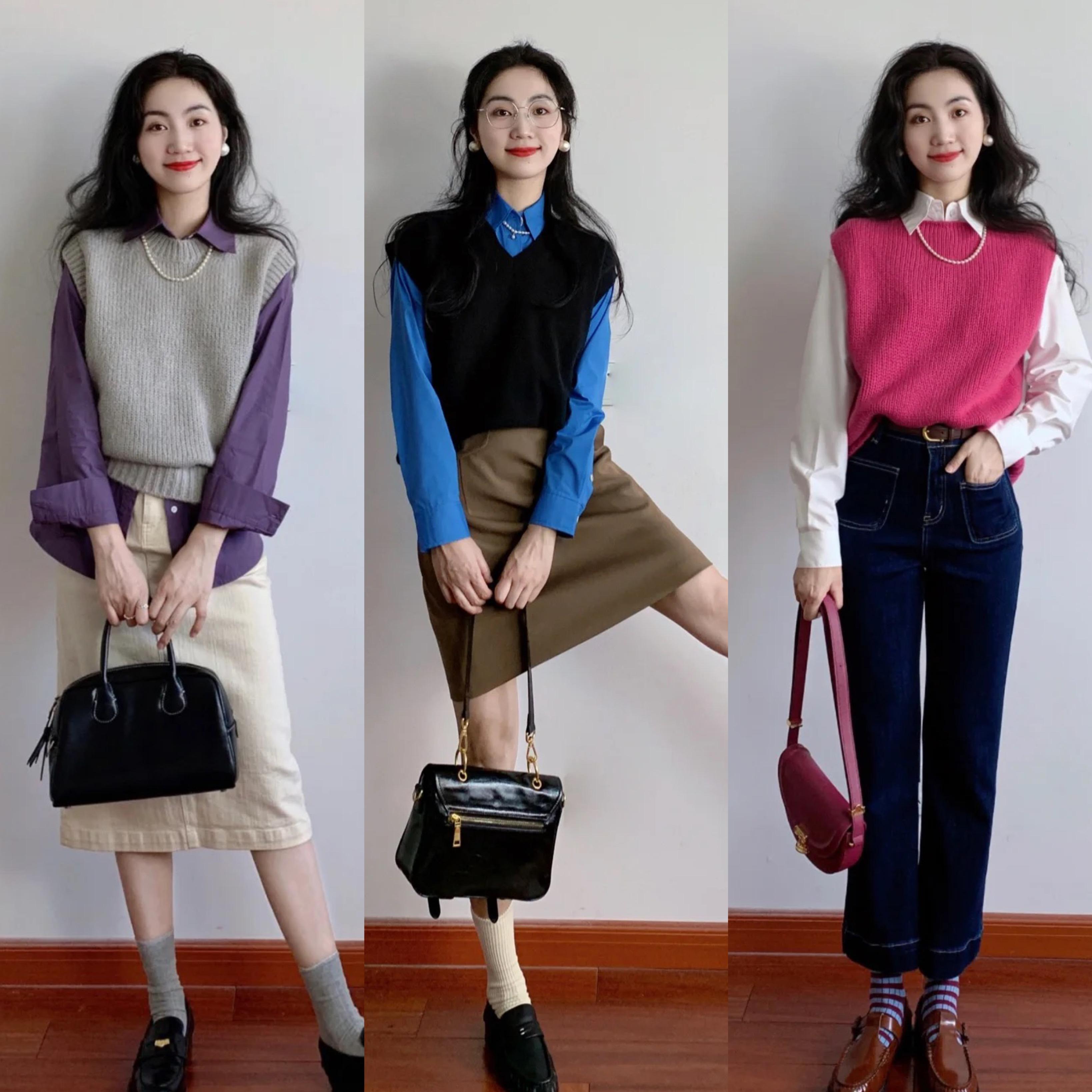 比如翻領襯衫+針織馬甲的疊搭,也讓我們的穿搭更具層次感。翻領的襯衫,可以相對寬鬆,但不要太廓形的剪裁,否則容易顯得臃腫不夠利落。